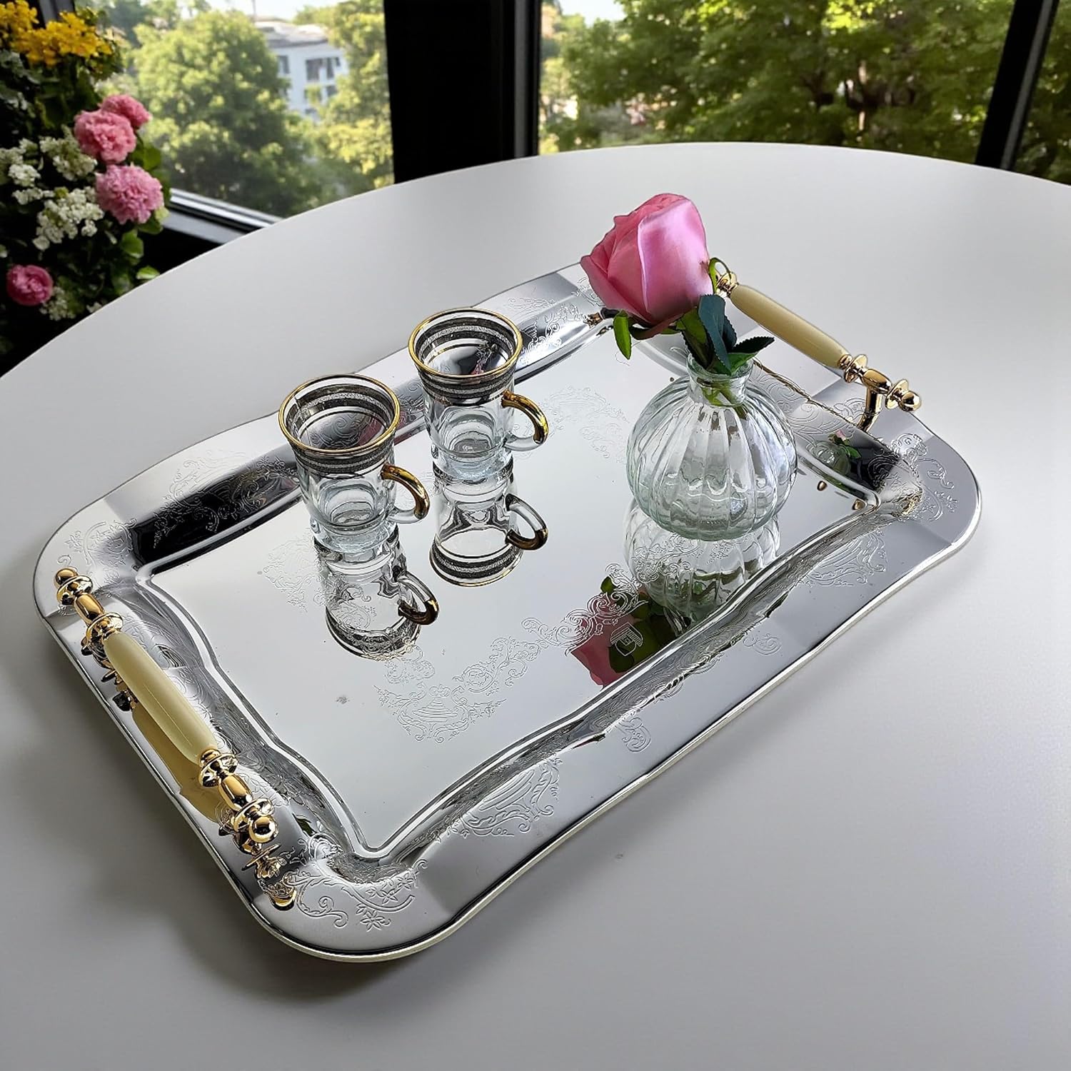 Pack of 1 elegant serving trays, outside dimension: 43 cm x 31 cm (or 16.9 inch x 12.2 inch), inside dimension: 32 cm x 20 cm (or 12.6 Inch x 7.9 Inch). (Tray size only; handle size is NOT included.)
