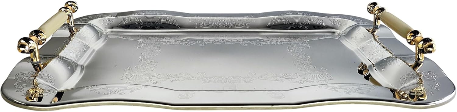 16.9 inch x 12.2 inch Oblong Chrome Plated Serving Tray with Iron Gold Handles Stylish Design Floral Engraved Edge Decorative Party Wedding Dessert Buffet Wine Platter Plate Gift NC-029
