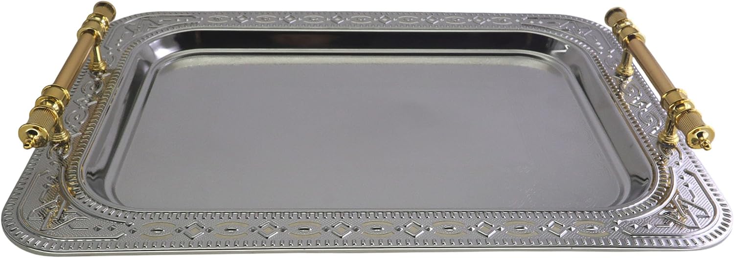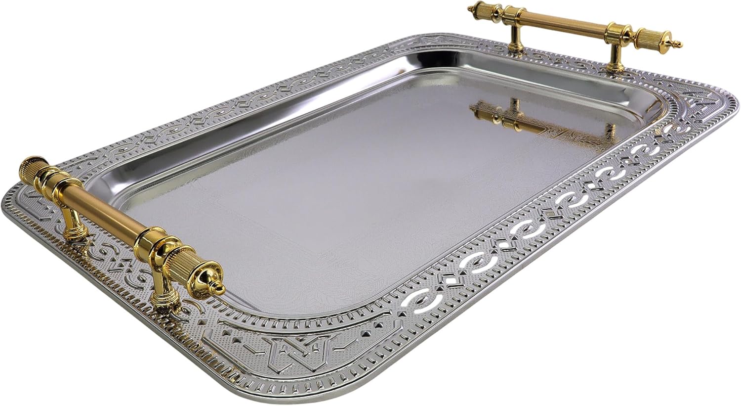 Pack of 1 elegant serving trays, outside dimension: 43.5 cm x 31.5 cm (or 17.1 inch x 12.4 inch), inside dimension: 33 cm x 21 cm (or 13 Inch x 8.3 Inch). (Tray size only; handle size is NOT included.)