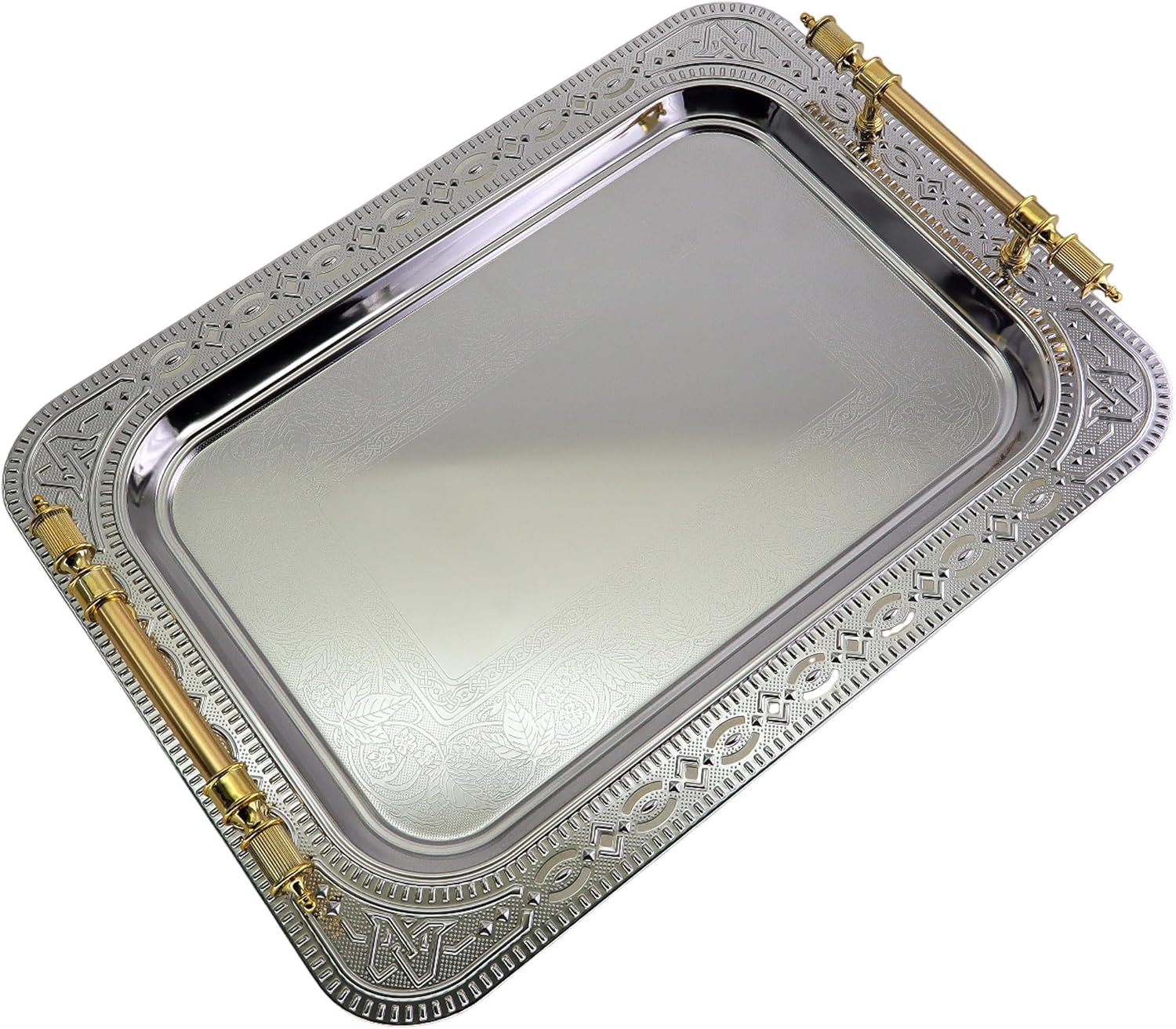17.1 inch x 12.4 inch Oblong Chrome Plated Serving Tray with Iron Gold Handles Stylish Design Floral Engraved Edge Decorative Party Wedding Buffet Wine Platter Plate NC-144