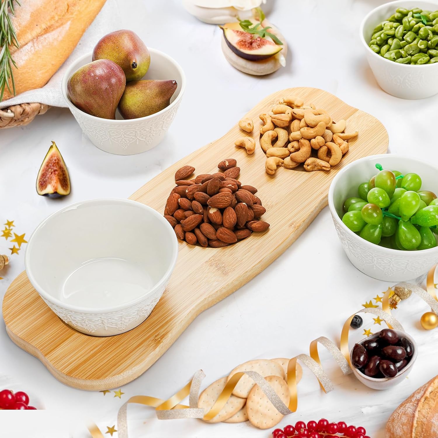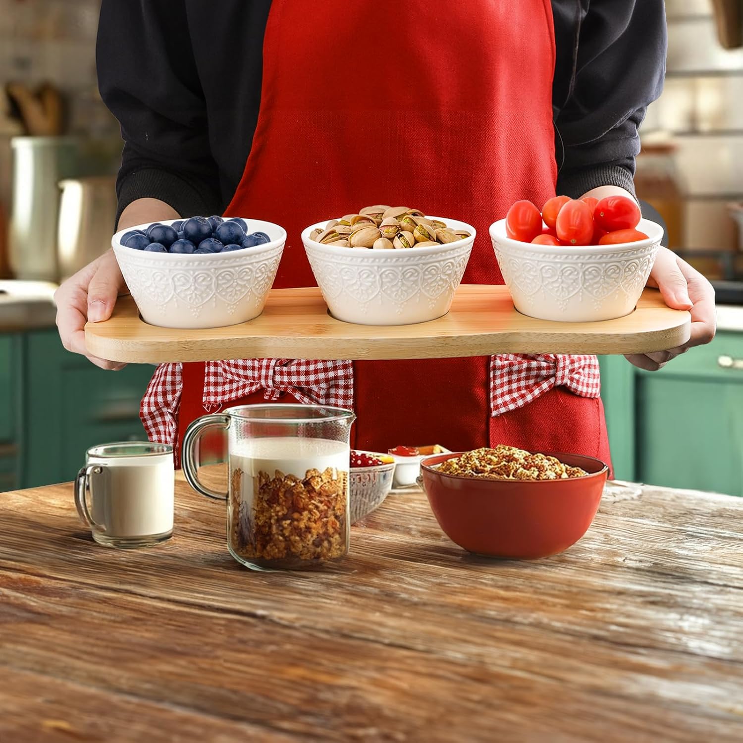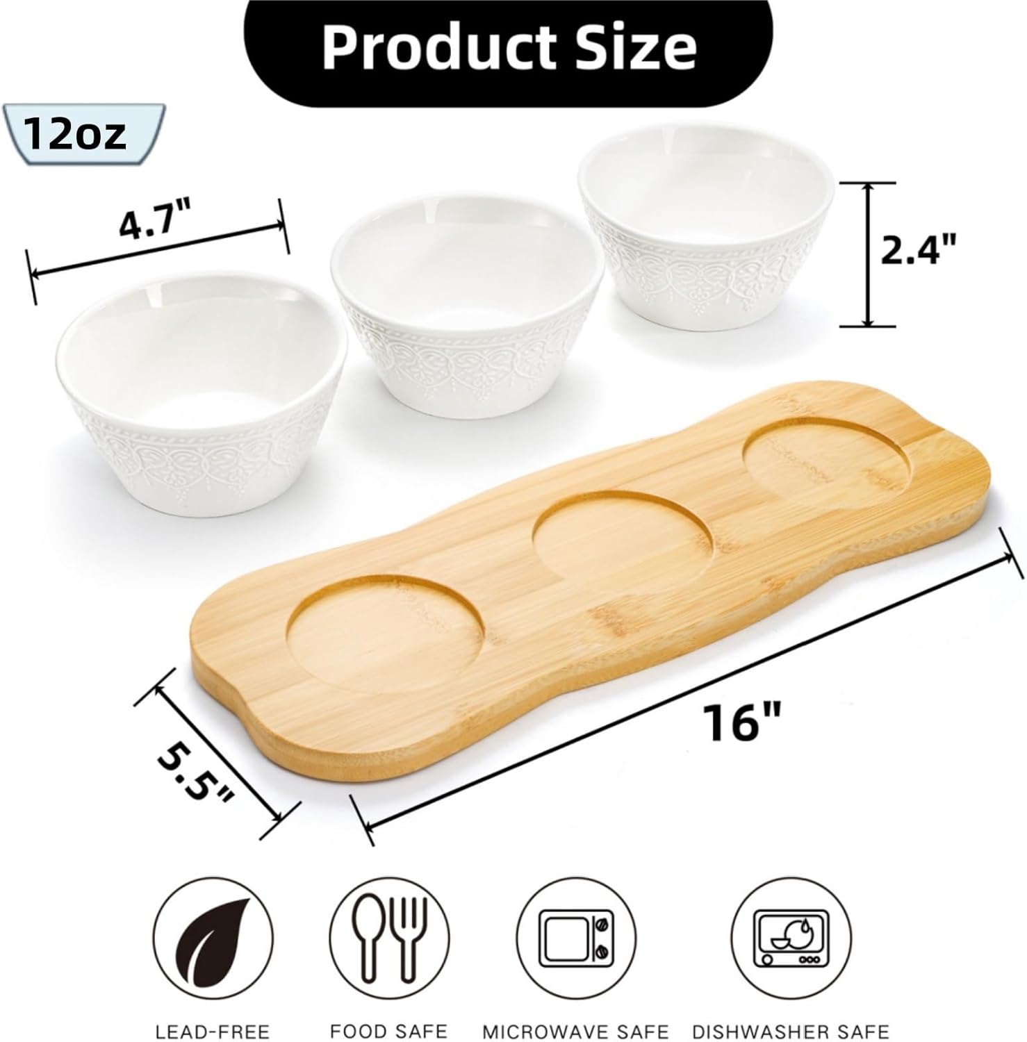 3 Pack Chips and Dip Serving Bowl with Bamboo Tray, 12 Oz Ceramic Condiment Tray, White Sauce Dipping Bowls, Snack Serving Dishes for Appetizer, Fruit, Nuts, Dessert