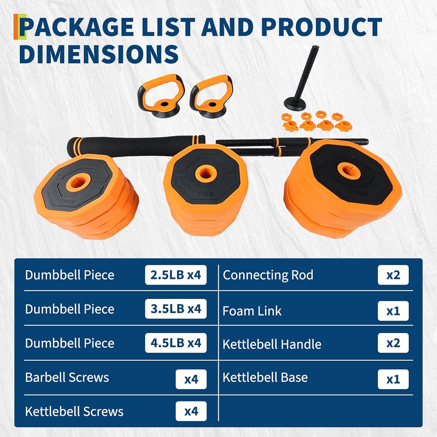 QUICK-CONVERT SYSTEM: Effortlessly switch modes in seconds with safety-lock nuts – no tools required. Includes 2 dumbbell bars, kettlebell rod, foam connectors, and 16 weight plates (2.5/3.5/4.5 lbs) for precise weight customization.
