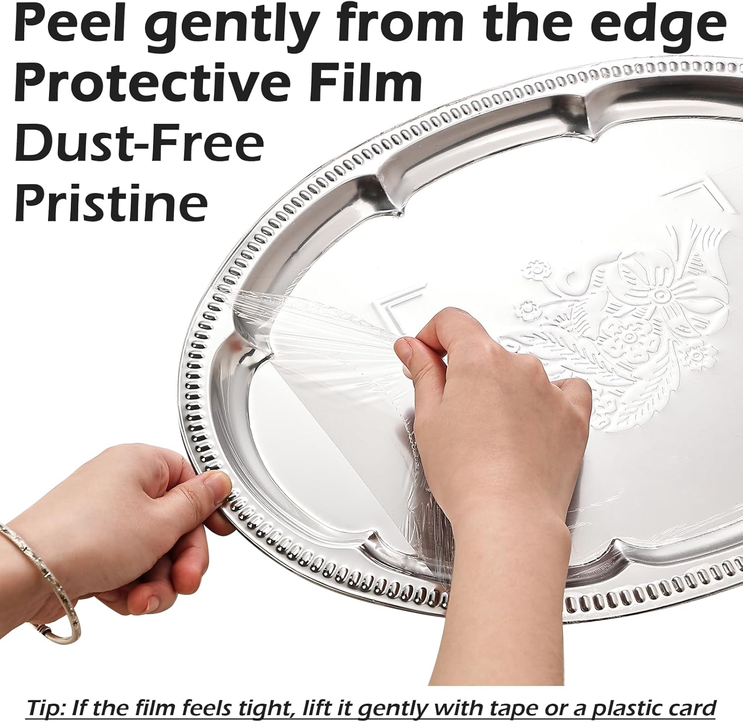 PEEL-OFF DUST PROTECTOR – Each tray is covered with a tight, dust-proof film to keep the surface spotless during shipping. The film is firmly attached for full protection — please peel it off slowly from the edge before use to reveal the mirror shine.(Tip: lf the film feels tight, lift it qently with tape or a plastic card)