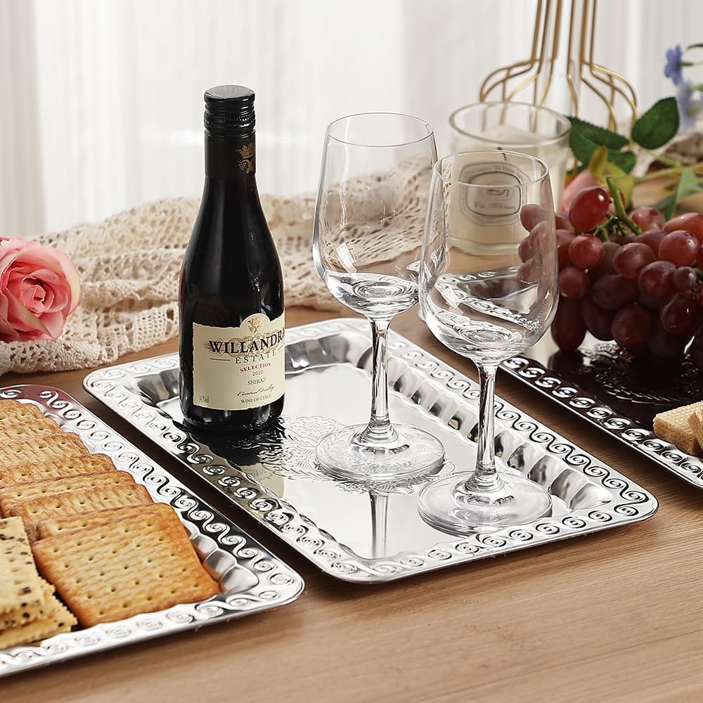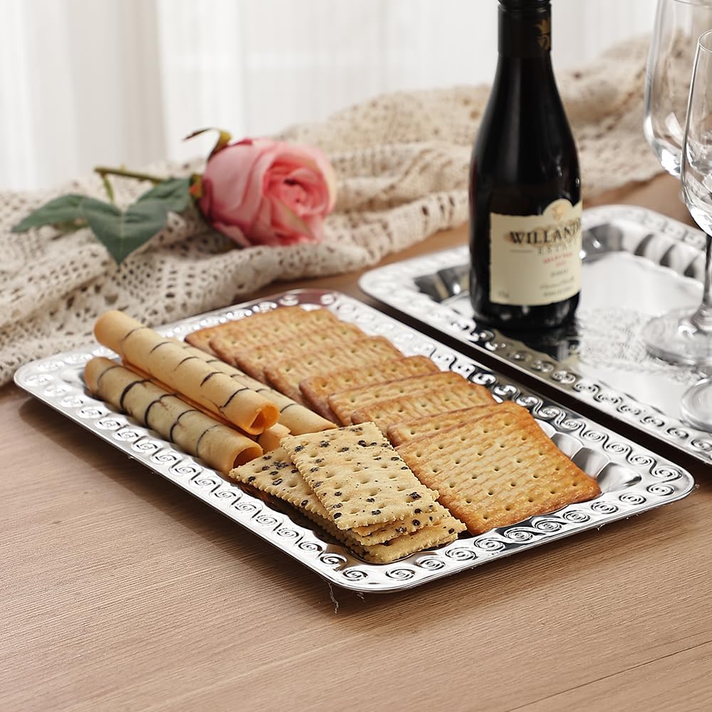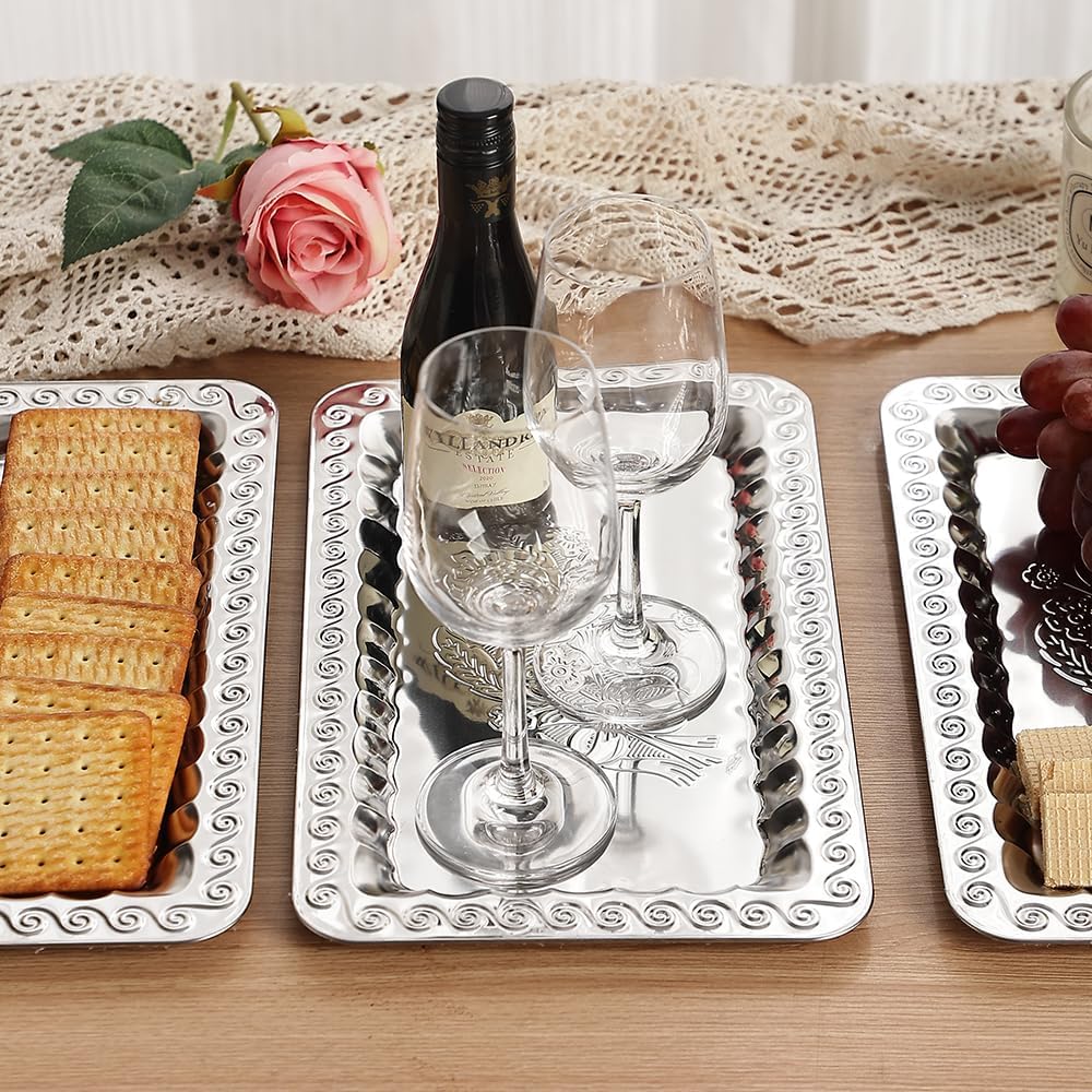 ELEVATE WEDDING ELEGANCE – Intricately embossed silver trays showcase cakes and champagne with refined brilliance. Maintains mirror-like shine after repeated washing—no fading or clouding even under event spotlights.