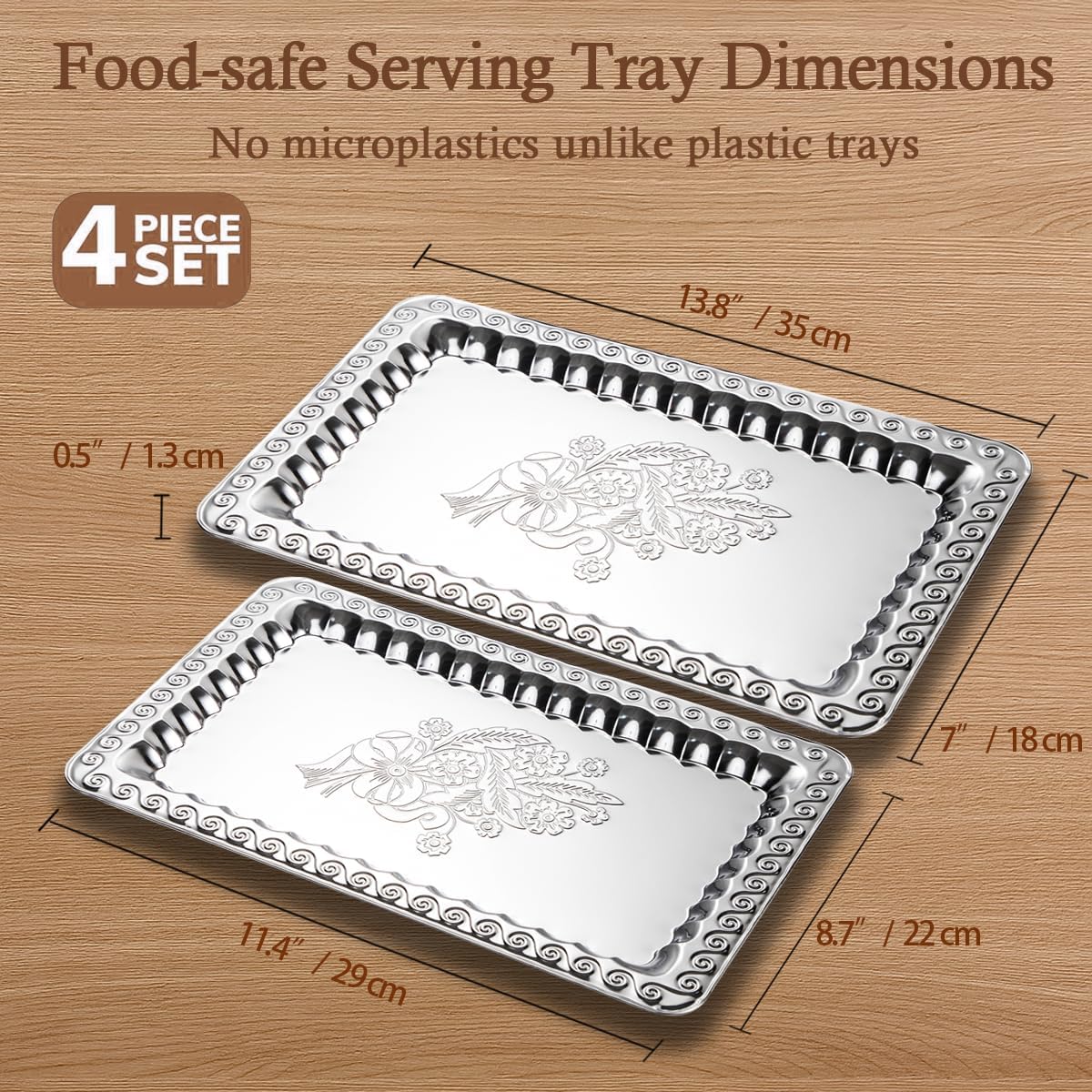 PREMIUM STAINLESS STEEL SERVING TRAYS SET (4-PIECE) – Impress your guests with 4 sleek, mirror-finished trays made of durable food-grade stainless steel. Designed with a refined, lightweight profile for effortless serving and storage — sturdy enough for everyday use yet elegant enough for formal occasions. Each tray (13.8”×8.7”×0.5”) resists rust, stains, and odors while showcasing your food beautifully.