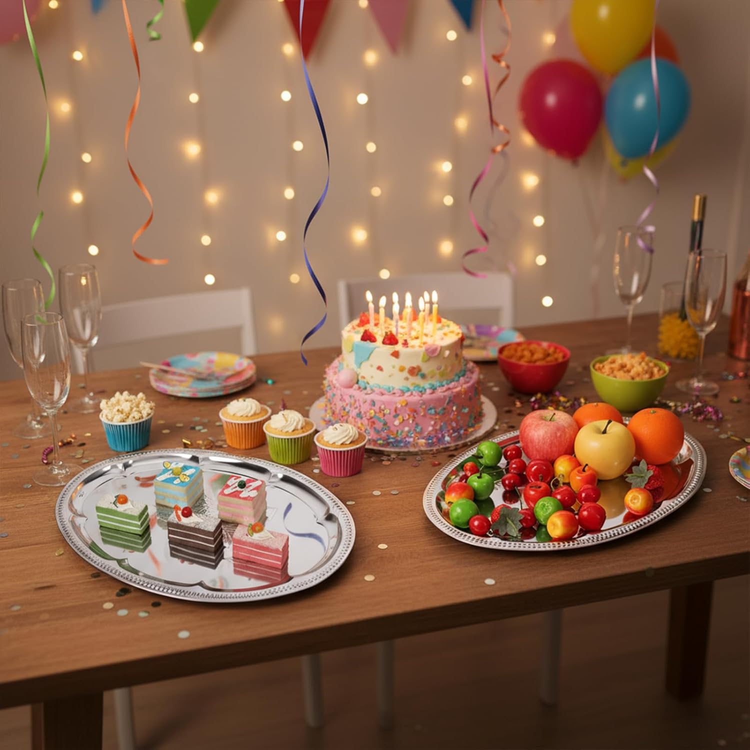 Food-Grade Stainless Steel for Safety & Longevity: Crafted from high-quality stainless steel, these silver trays are harmless, non-toxic, and resistant to rust, impact, and high temperatures. Smooth edges prevent scratches, and the mirror-polished surface boosts aesthetics, complementing any dining set. They’re durable enough for long-term home or light commercial use, ensuring safe, reliable food contact