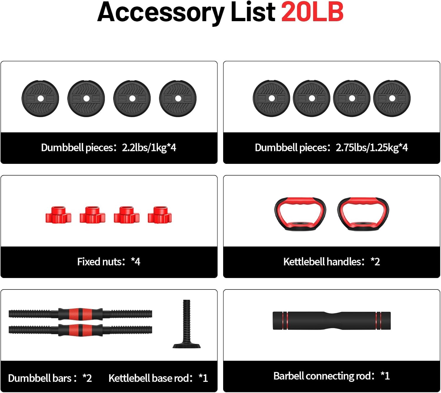WEIGHT PACKAGE LIST – 20 lbs fitness dumbbells include: 4 × 2.2lbs weight plates,4 × 2.75lbs weight plates,4x dumbbell nuts,2 × kettlebell handles, 1 × barbell connecting rod ,1 × kettlebell base rod and 2x dumbbell bars. You can choose different weights according to your own preferences to meet the intensity needs of you and your family at different stages of exercise