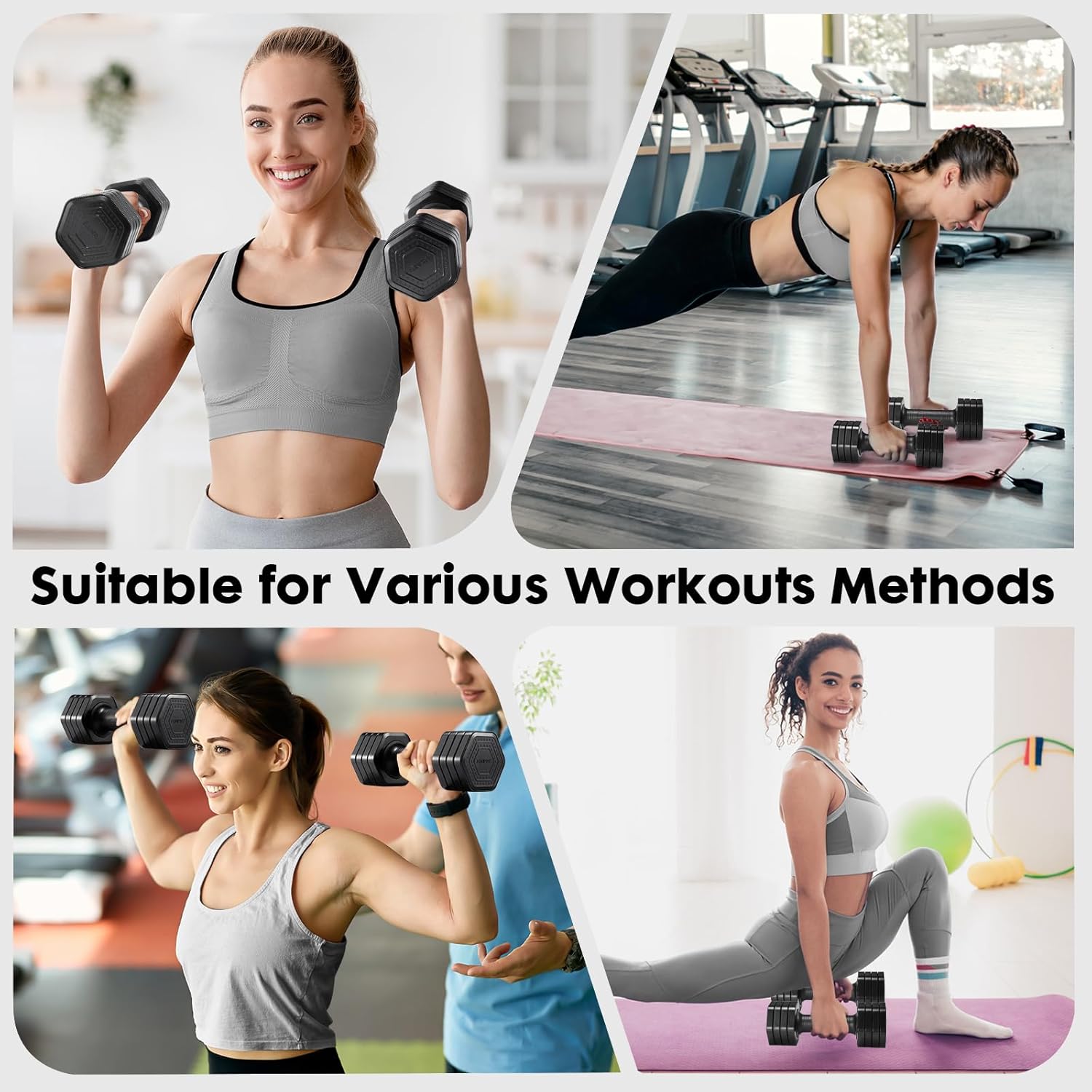 Adjustable Weights for Women: Equipro Adjustable dumbbell set measures 5.51 to 8.66 (length) x 3.43 (width) x 3.15 (high) inch, which is specially designed for women with a 4.5 soft TPU rubber handle, providing a comfortable grip during training.