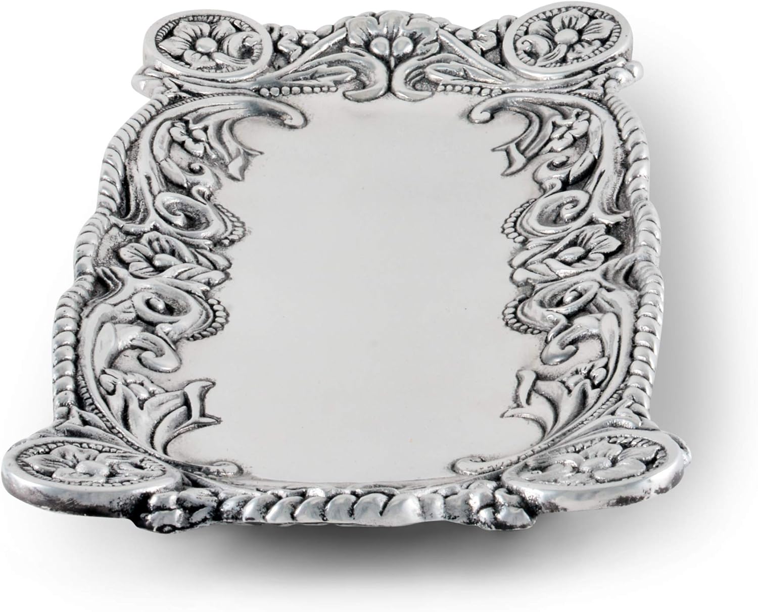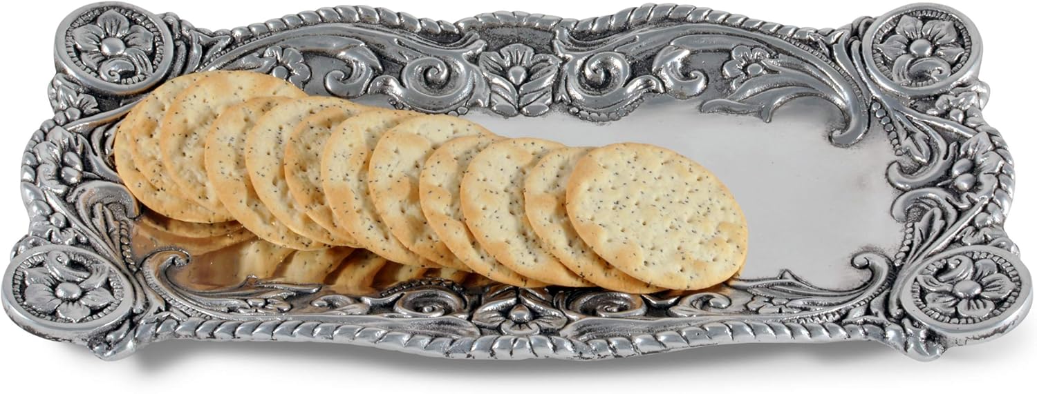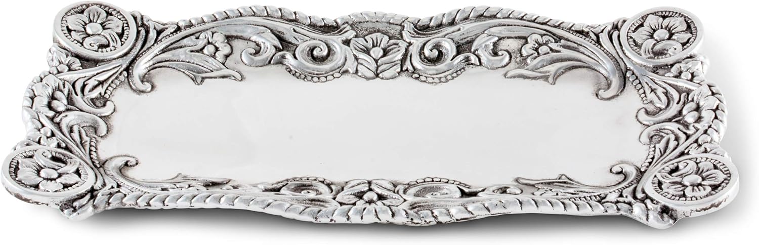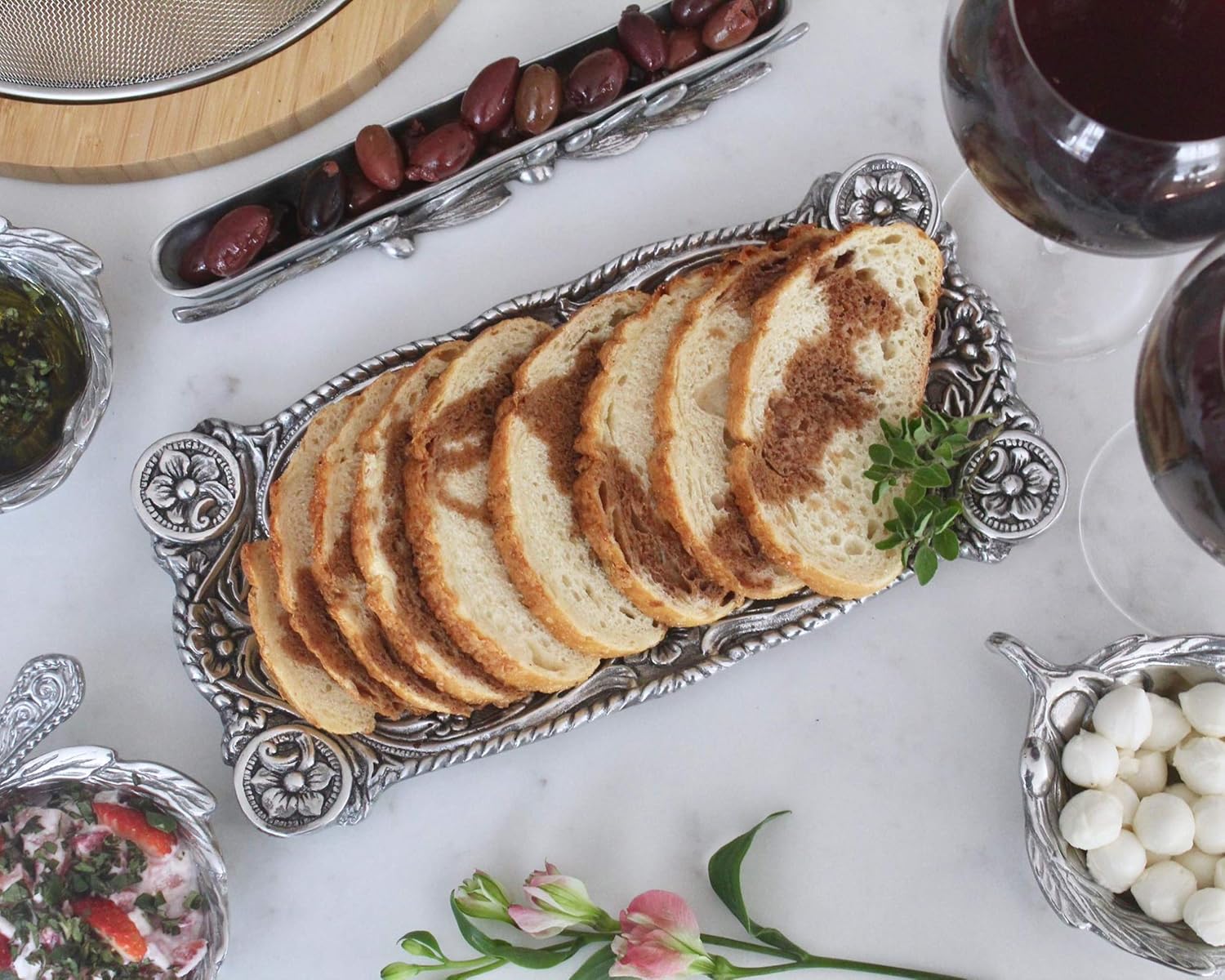Handcrafted, designer aluminum bread tray features the romantic, ornate detail of the old west