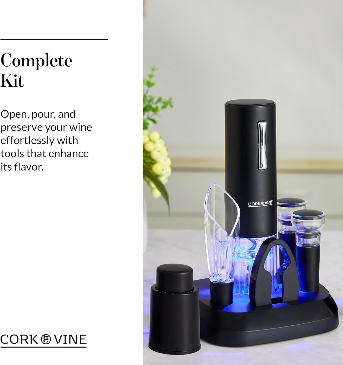 Rechargeable Corkscrew: Imagine having to use an old-school corkscrew to uncork a bottle of wine. Sure, there are more modern corkscrews out there, but this set includes a rechargeable one that automatically uncorks a bottle within seconds. Easy, fast, and convenient.