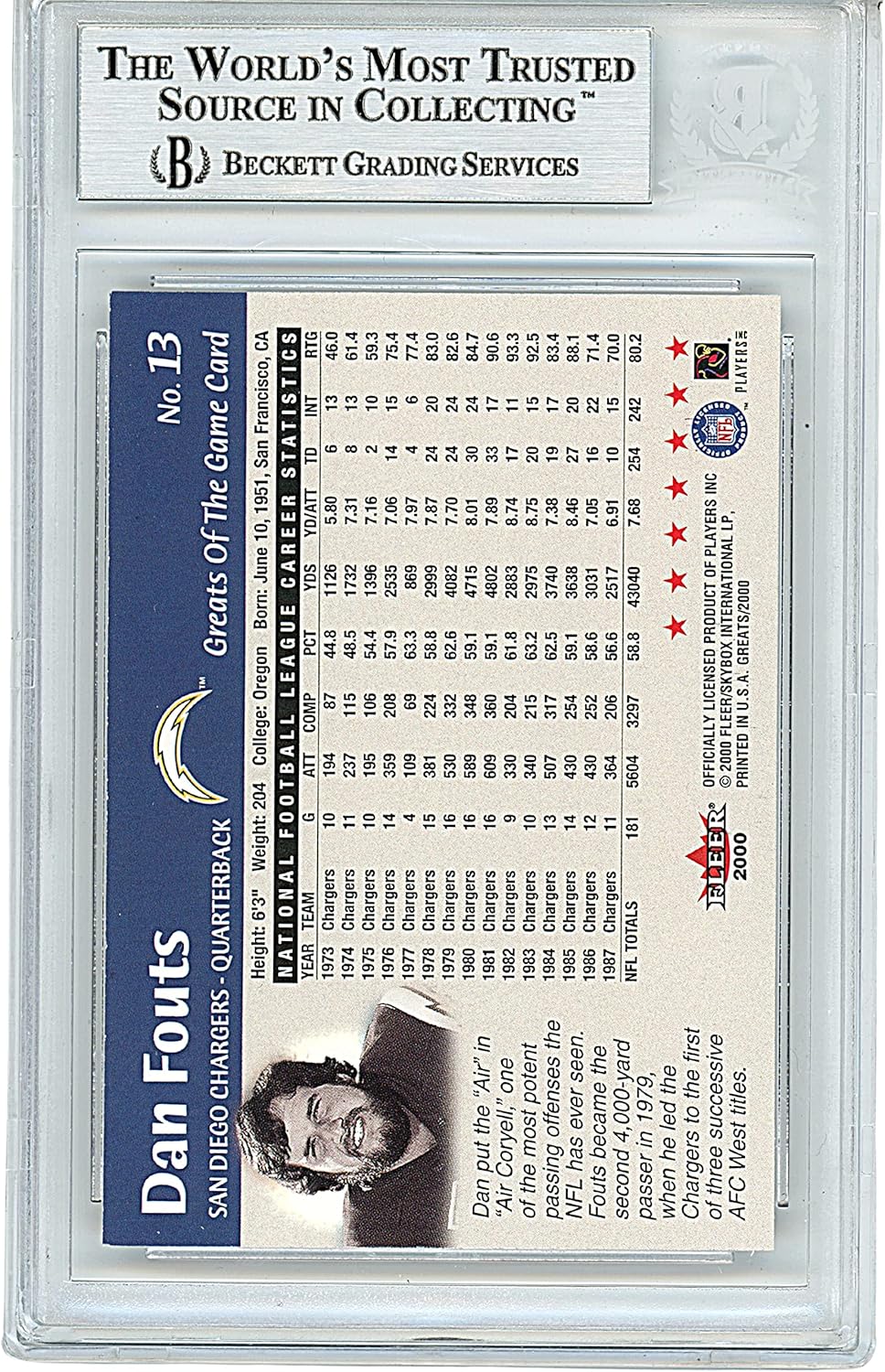 Enhance your football card collection with this Dan Fouts autographed football card. Featuring the 2000 Fleer Greats of the Game Topps football card #13, this unique piece captures Dan Fouts during his time with the San Diego Chargers. The card showcases his genuine blue sharpie signature, adding a personal touch and increasing its desirability. The authenticity of the autograph has been verified by Beckett Authentication Services (BAS), guaranteeing its genuineness. The card has also been expertly slabbed by BAS for preservation and authentication, ensuring its long-term quality. Measuring 3.25″ x 5″, the encapsulation serves as both protection and a Certificate of Authenticity (COA), providing you with peace of mind and a valuable collectible. This football card measures 2.5″ x 3.5″ and is a coveted item for both San Diego Chargers enthusiasts and football memorabilia collectors. The presence of the Beckett authentication number 00014226016 further affirms the authenticity of Dan Fouts’ autograph on the card. Own a remarkable piece of football history with this Dan Fouts autographed football card. It pays tribute to the exceptional career and contributions of one of the San Diego Chargers’ most iconic quarterbacks. Whether you’re an avid collector or a devoted fan, this collectible adds value to any sports memorabilia collection.