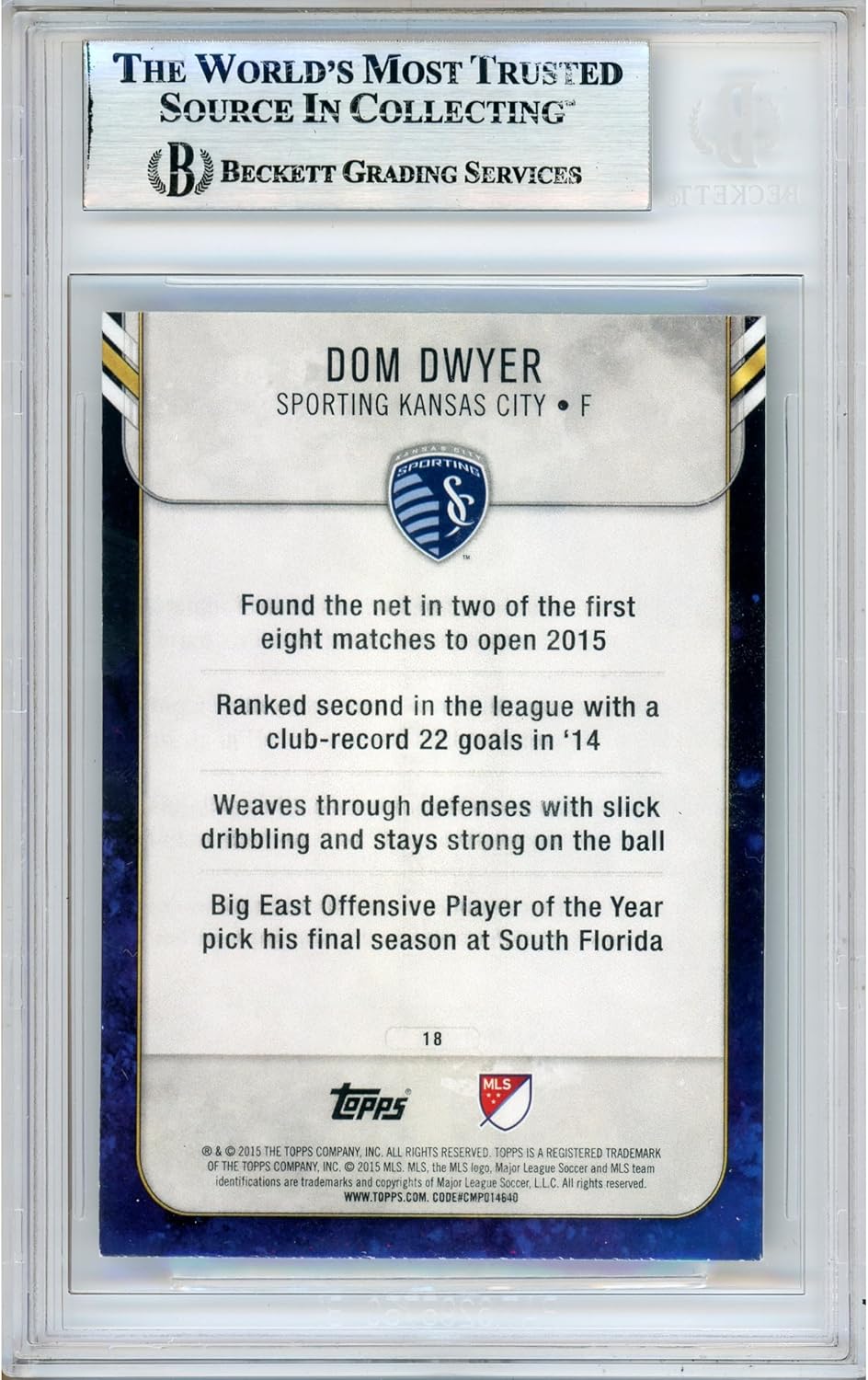 A treasure for soccer fans! Presenting the Dom Dwyer autographed 2015 Topps Apex MLS soccer card #18. As a key figure for Sporting Kansas City, Dom Dwyer’s flair and playmaking abilities have made him a standout player in Major League Soccer (MLS). This card beautifully portrays Dom Dwyer, accentuated by his black sharpie signature. It’s a testament to his impact on the field and his devotion to the game. Moreover, this card’s authenticity is beyond question as it’s verified by Beckett Authentication Services (BAS), coming with the authentication number 00017811310. Additionally, the card is encapsulated in a resilient 3.25″ x 5″ slab that protects the integrity of the signature and the card itself. Whether you’re a Sporting KC supporter, an MLS fan, or a devoted card collector, this Dom Dwyer signed card is a timeless piece that represents dedication and excellence in soccer. Don’t let this gem slip away! Click ‘Add to Cart’ to capture a slice of Sporting Kansas City’s history with Dom Dywer’s autographed card.