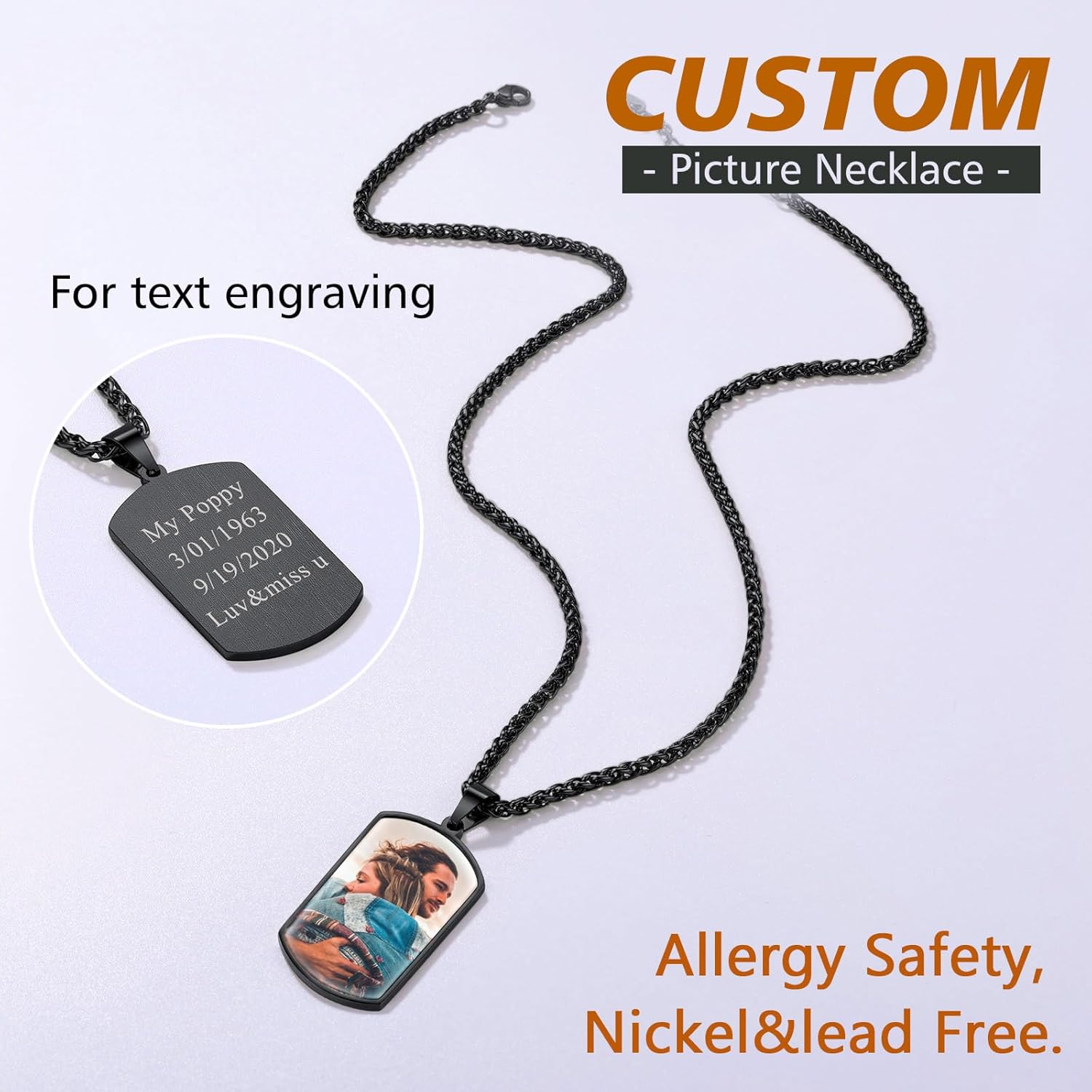 These photo necklaces are well crafted and produced perfectly, and have 3 color options: stainless steel/18k gold plated/black. You just need to click “Customize Now”, upload a picture from your device, enter some words, then we will produce a beautiful customized necklace/car hanging accessory.