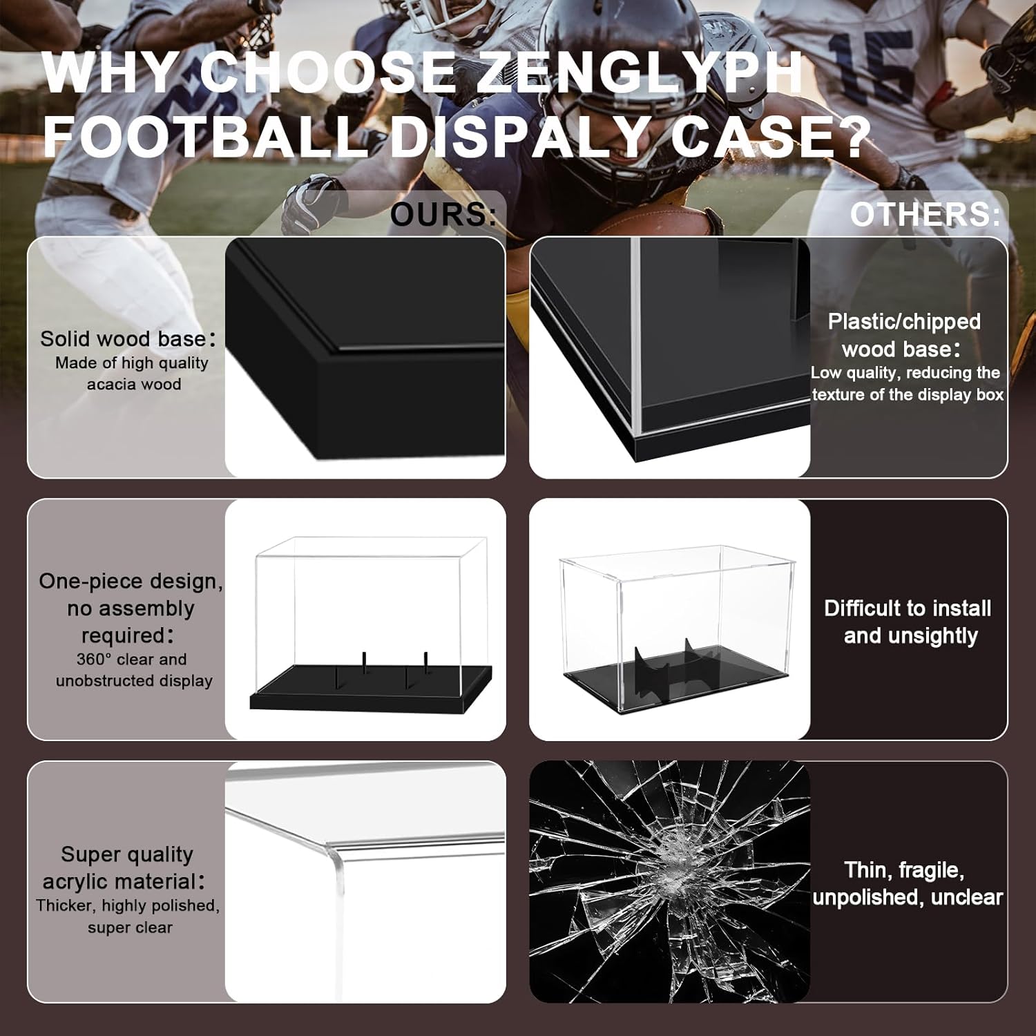 Premium UV-Protected Acrylic & Solid Wood Construction: Crafted with museum-grade acrylic walls 30% thicker than standard displays (3mm thickness), the ZenGlyph football case features advanced 99% UV-blocking technology to eternally safeguard autographs from fading. Its hand-polished crystal-clear enclosure harmonizes with a rugged acacia wood foundation, creating an heirloom-quality preservation system designed to protect your memorabilia for generations.