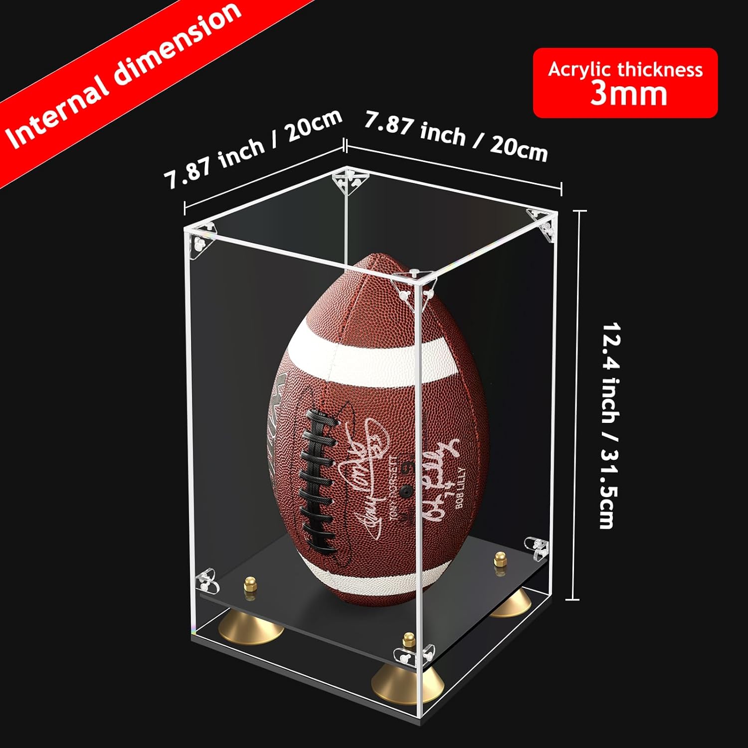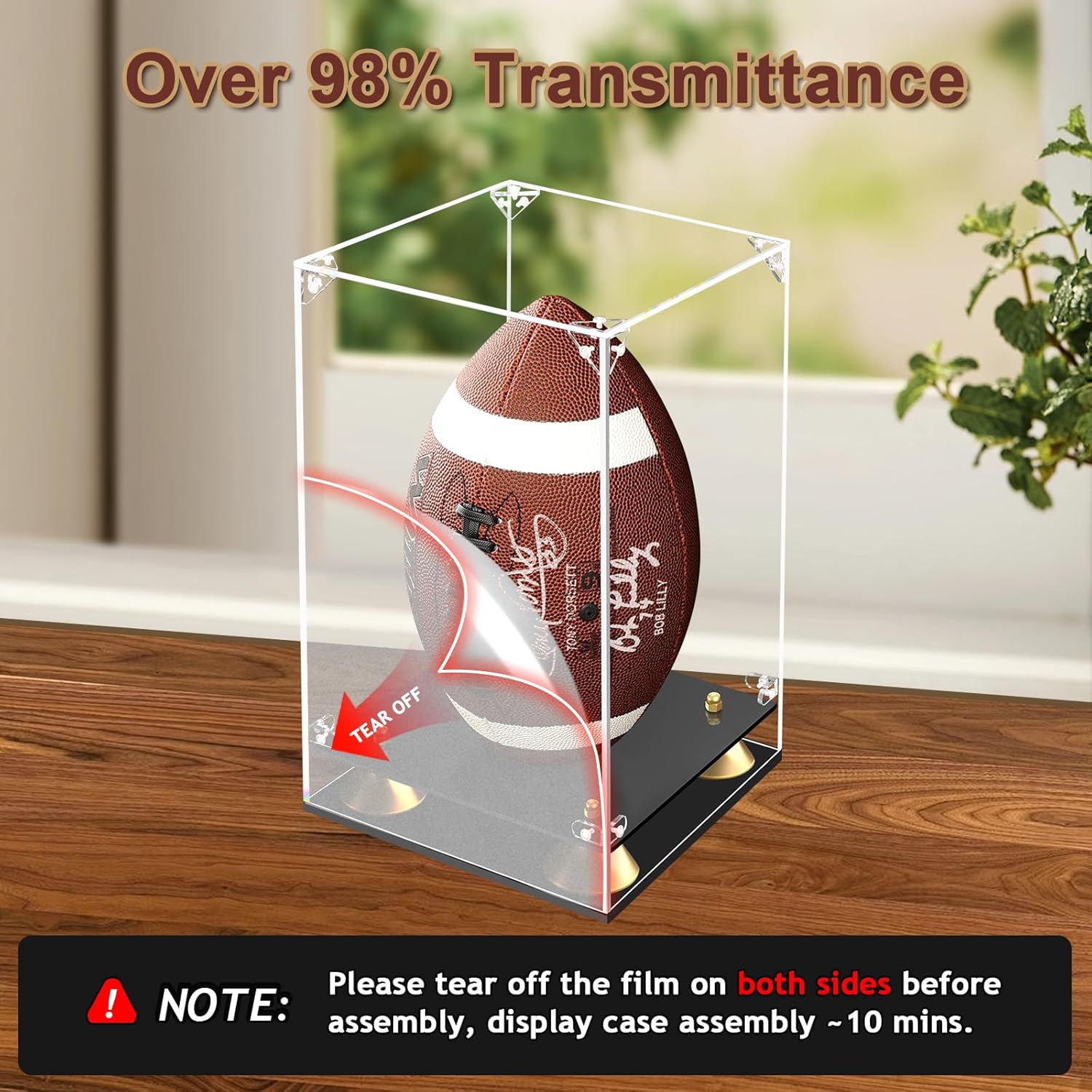 【Fit All Size】The interior dimensions of the upright football display case is 8x8x12.5 inches, which is large enough to fit any size football. NOTE: Please tear off the protective film on both sides of each acrylic panel before assembly