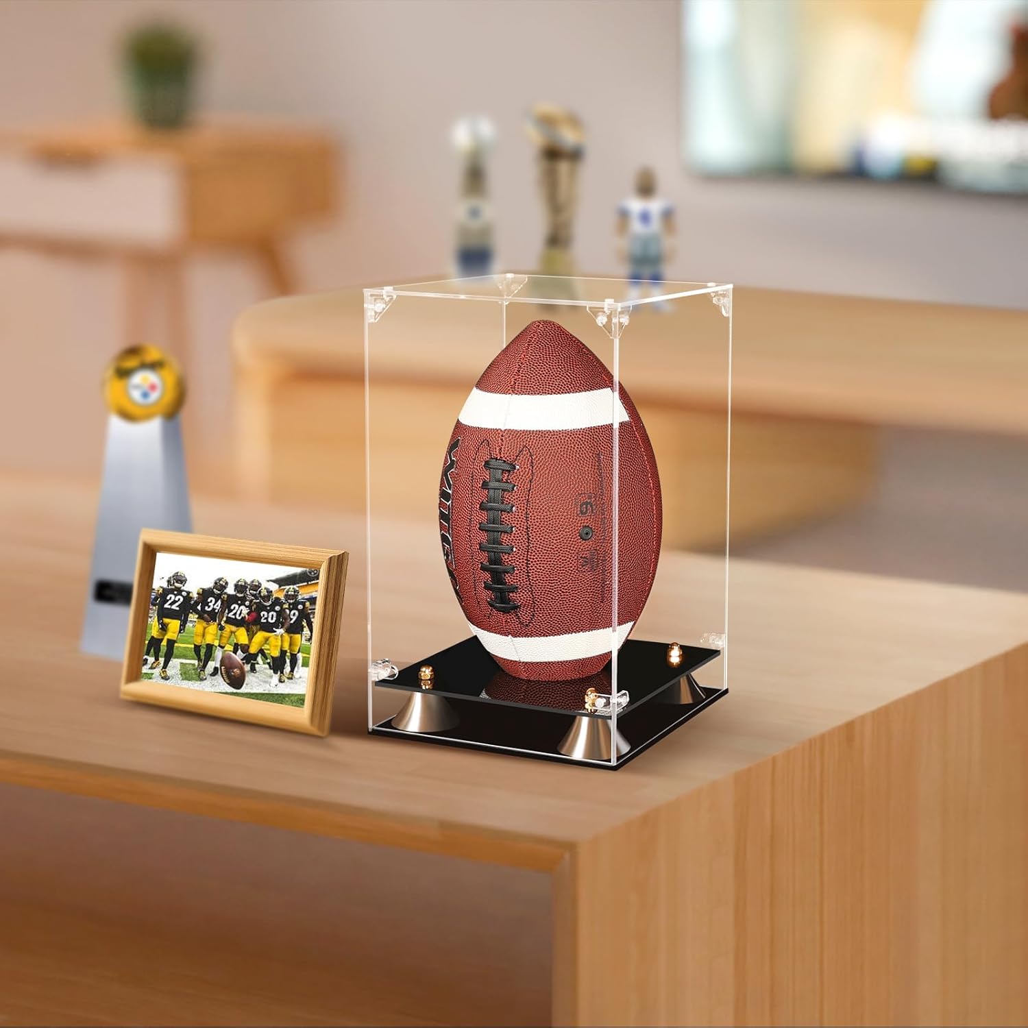 Football Display Case Full Size, Clear Acrylic Box with Double Layer Base Display Stand for Football Fans & Collectors, Sports Collectibles, Assembly Required, Black Base