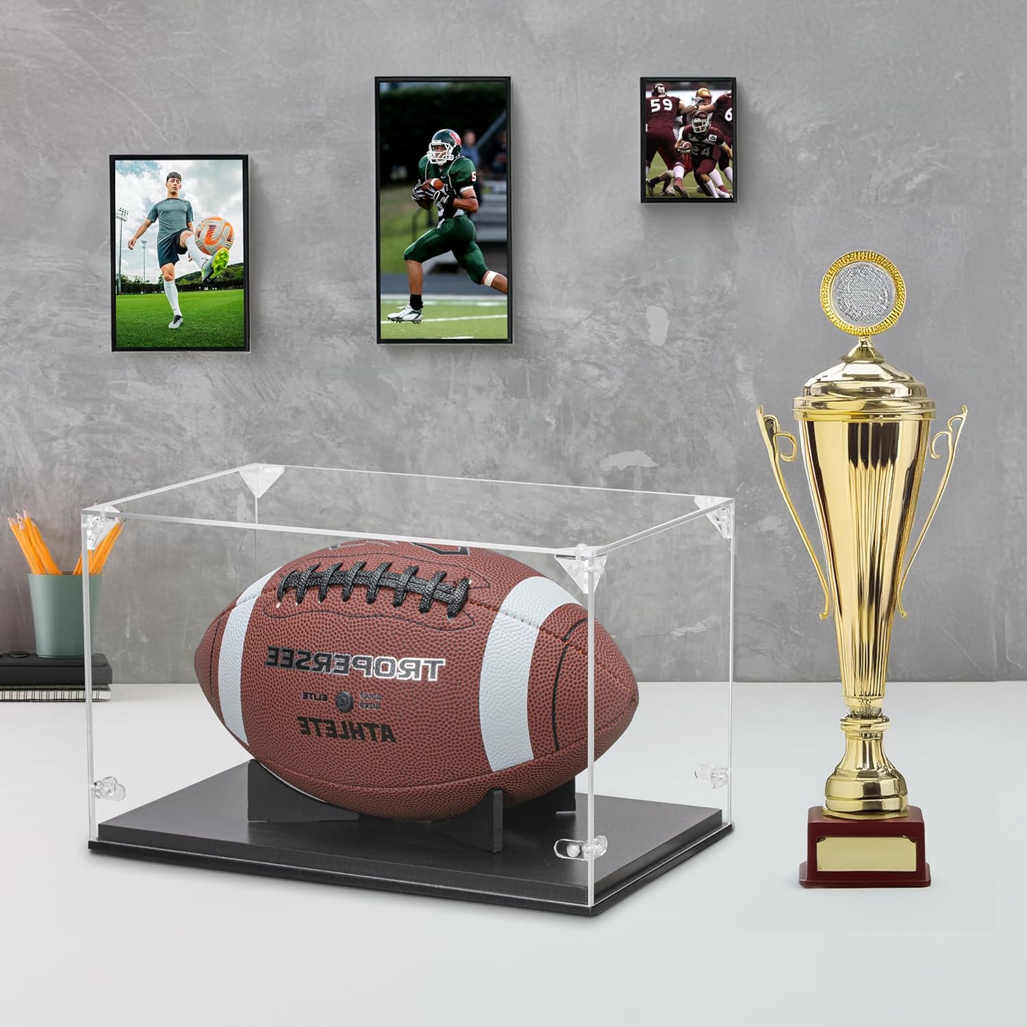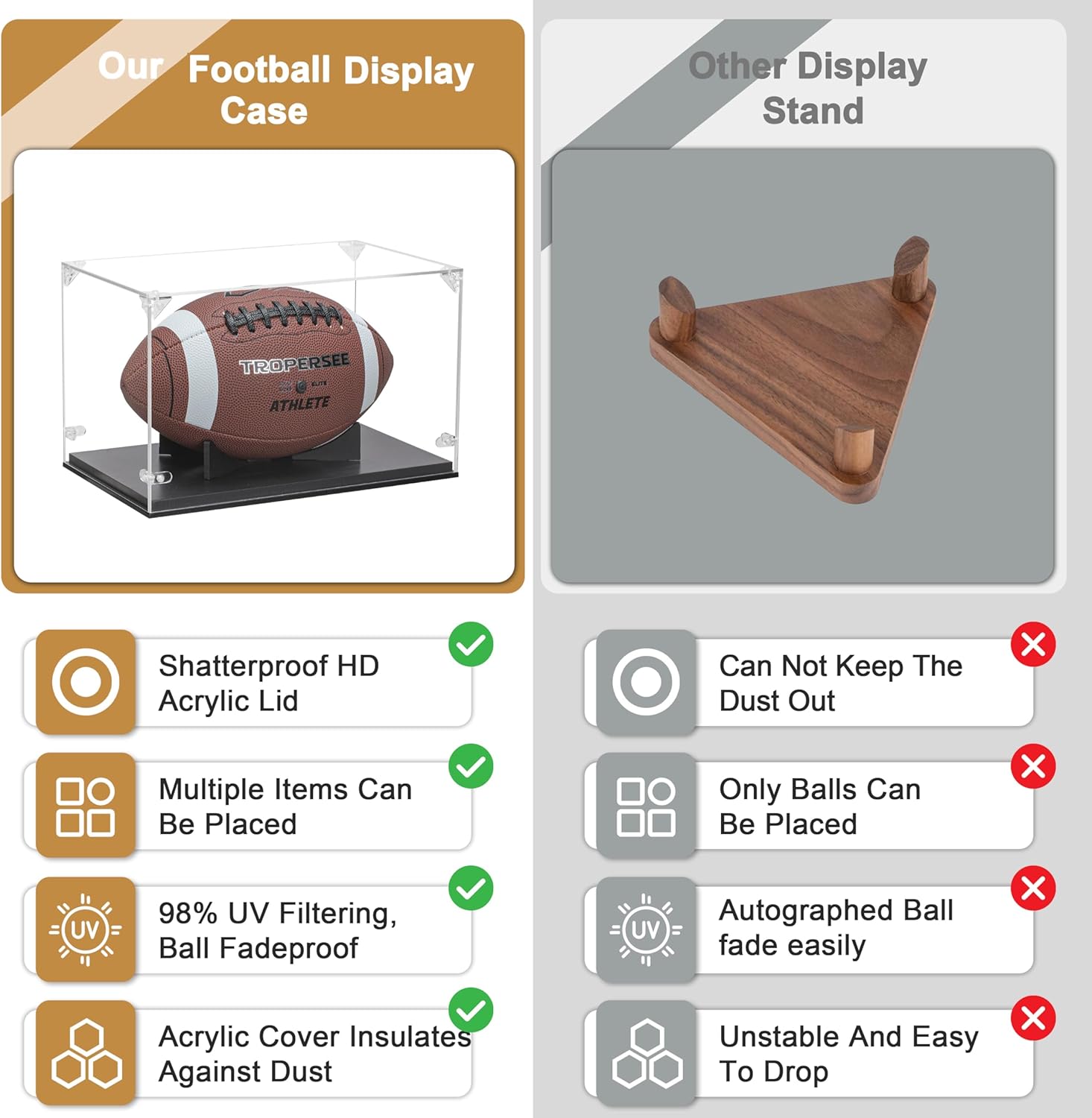 [EXCEPTIONAL QUALITY] – Constructed with thickened clear acrylic lid and high quality wood base stand, our football display holder offers durability and protection. The high definition acrylic lid displays your autographed balls clearly and effectively while still keeping them dust-free. Special acrylic glass material filters out most of the UV rays to prevent balls fading.