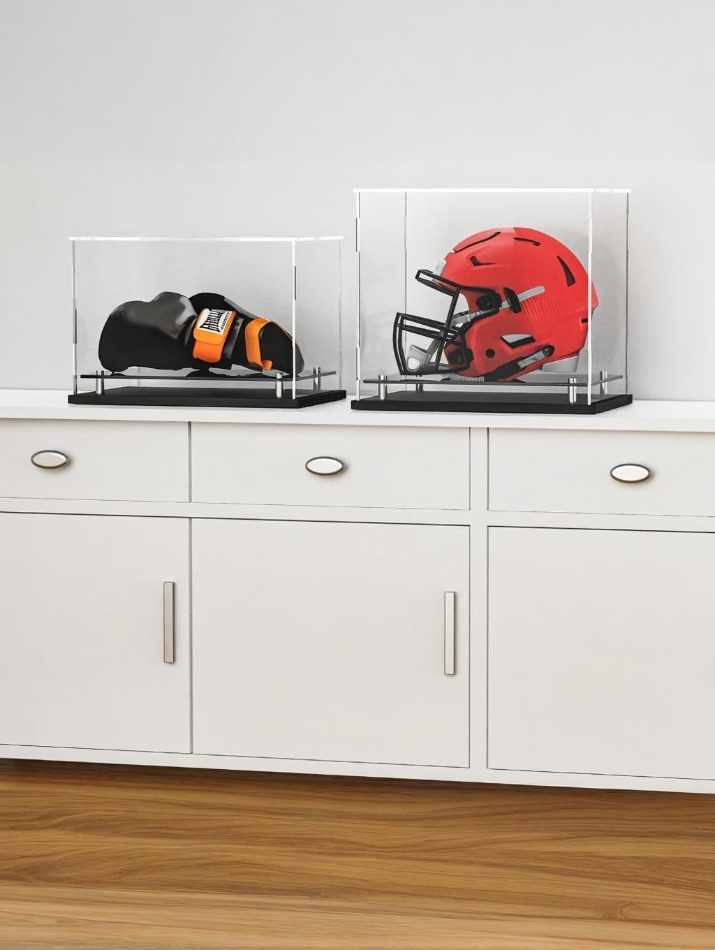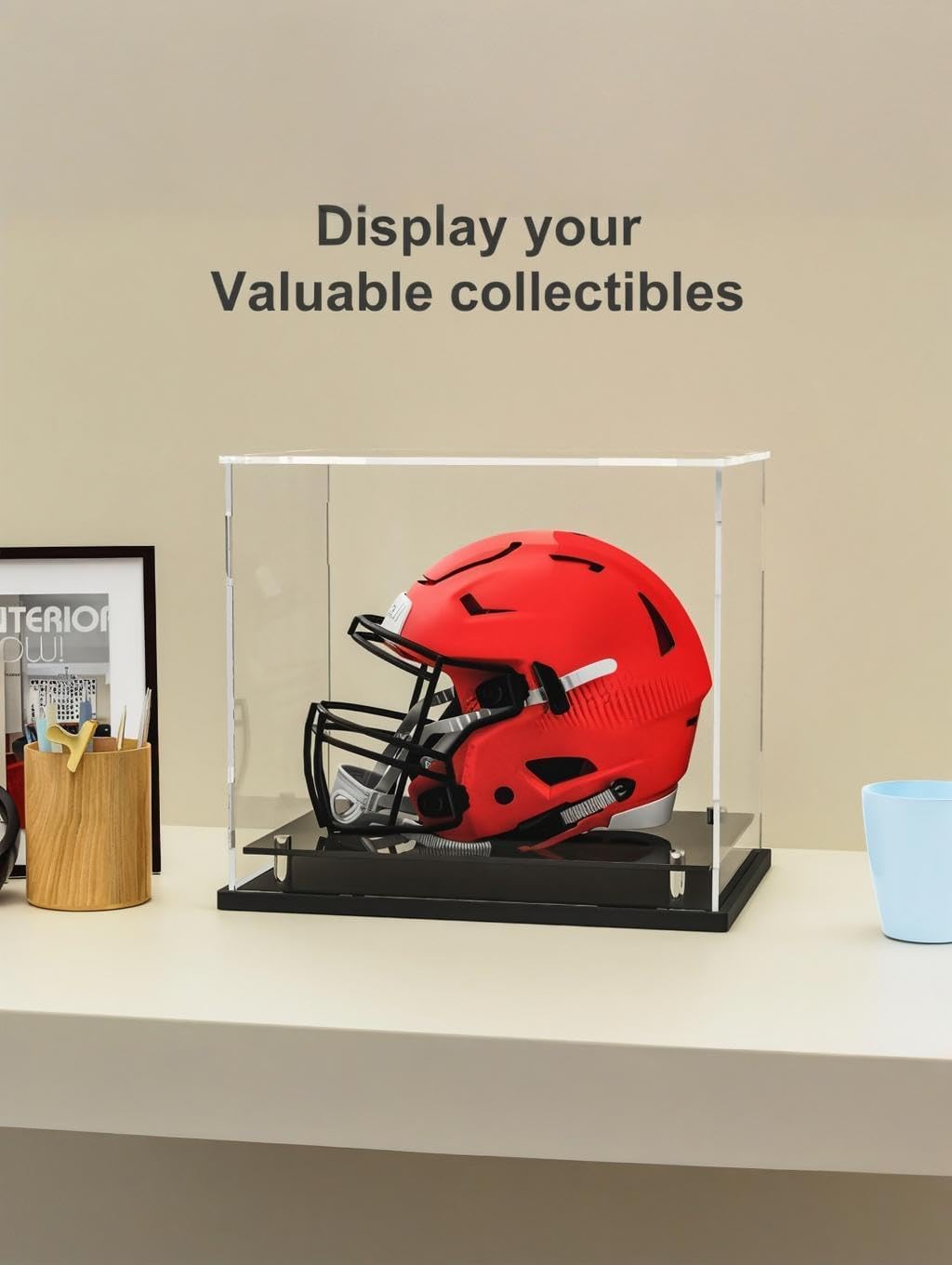 【Helmet Display Case for Memorabilia】–A full size helmet display case is a great way to display your collectibles, football, basketball, baseball gloves, action figures, models,etc. The Acrylic boxes for display can be used in many occasions, including the home, retail store, museum or trade show. Clear display case for fragile and priceless things, as well as any other items you want to preserve secure.