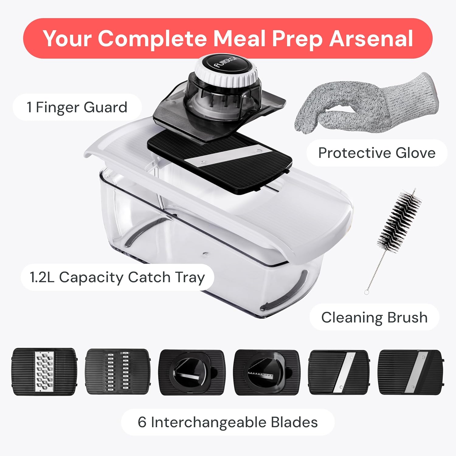 Fullstar Mandoline Slicer for Kitchen, Fruit Cutter, Cheese Grater, Cucumber Slicer, Veggie Spiralizer, Food Cutter & Kitchen Gadgets with Safety Glove (6 in 1, Black)