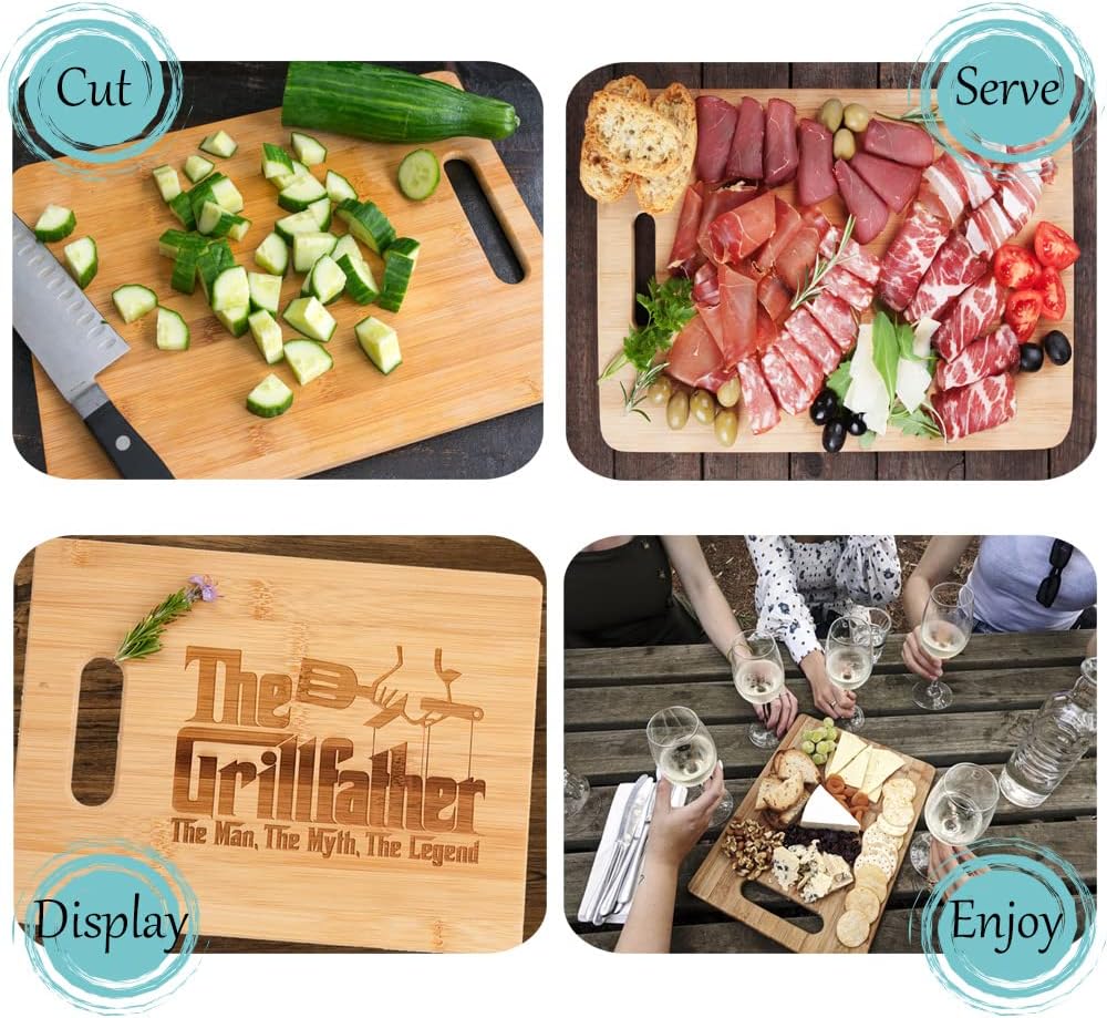 Reminisce Godfather Corleone with this beautifully engraved Grillfather cutting board. Wood type: Moso bamboo, a renewable, sustainable resource Size: 9.5″ x 13″ with handle Moso Bamboo makes the ideal cutting board surface. Lightweight and super strong yet easy on knives. Hand wash with soap and water. As with all natural wood cutting boards, do no soak or wash in the dishwasher.
