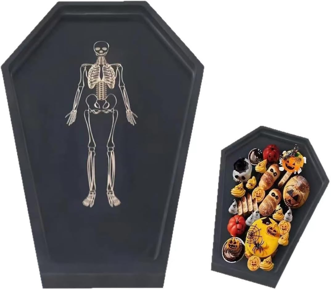 This Wood Coffin Shaped Charcuterie Board Tray is Made From Naturally Durable and Renewable Solid Pine, It’s A Bit Heavy About 0.8 lb, But It’s Easy to Carry and Use, Great for Spooky Gatherings, This Tray’s Skeleton Design Peeks Through Food for A Fun Surprise.