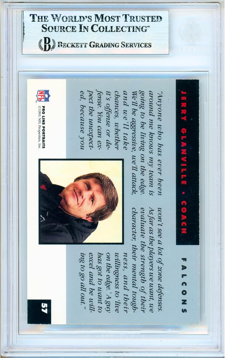 Presenting an autographed 1991 Pro Line Portraits football card by Jerry Glanville, capturing his legendary football career. Emblazoned with Glanville’s signature in a clear silver sharpie, this card connects you to an iconic football head coach who left a lasting legacy with the Atlanta Falcons. The autographed card, standard trading card size at 2.5″ x 3.5″, showcases a sharp, bold signature from Jerry Glanville himself. The card has been meticulously authenticated and slabbed by Beckett Authentication Services (BAS), the leading name in sports memorabilia authentication. The card’s BAS authentication number is 00014893249, further assuring you of its authenticity. Encased in a robust 3.25″ x 5″ slab, this signed card is shielded from damage, ensuring it remains in top condition for years to come. The slab also serves as a Certificate of Authenticity (COA), leaving no doubt as to the card’s genuineness. This Dan Reeves signed card celebrates his iconic coaching career, from the Falcons and his racing victory with the Nascar. Ideal for any football fan, this signed piece would be a prized addition to any sports memorabilia collection.