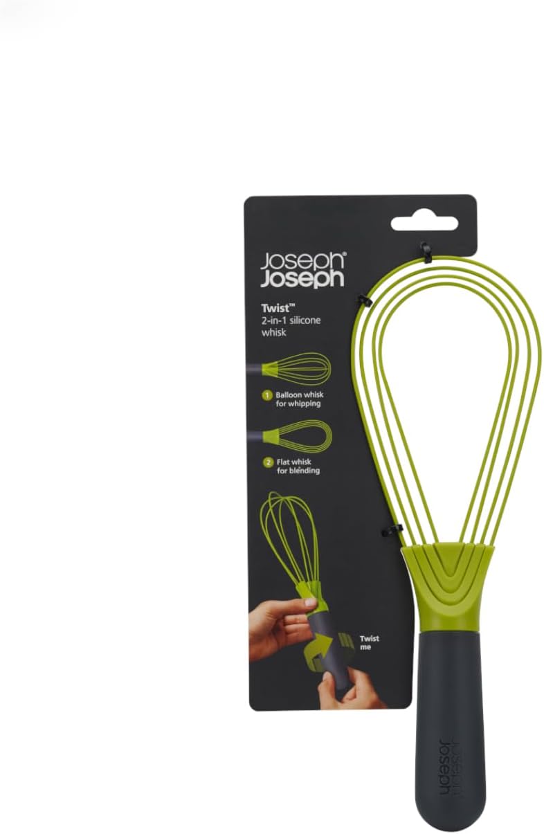 With a simple twist of the handle, this clever design switches between two different types of whisk. In its closed or flat position, it’s ideal for stirring sauces or making gravy as its heat-resistant, silicone-coated stainless-steel wires are perfect for scraping and combining ingredients together. In its open position, it becomes a conventional balloon whisk that’s perfect for whipping cream or beating egg whites into peaks. Suitable for non-stick cookware, it also folds flat for compact storage. Silicone wires heat-resistant up to 200˚C/392˚F. Dishwasher safe.