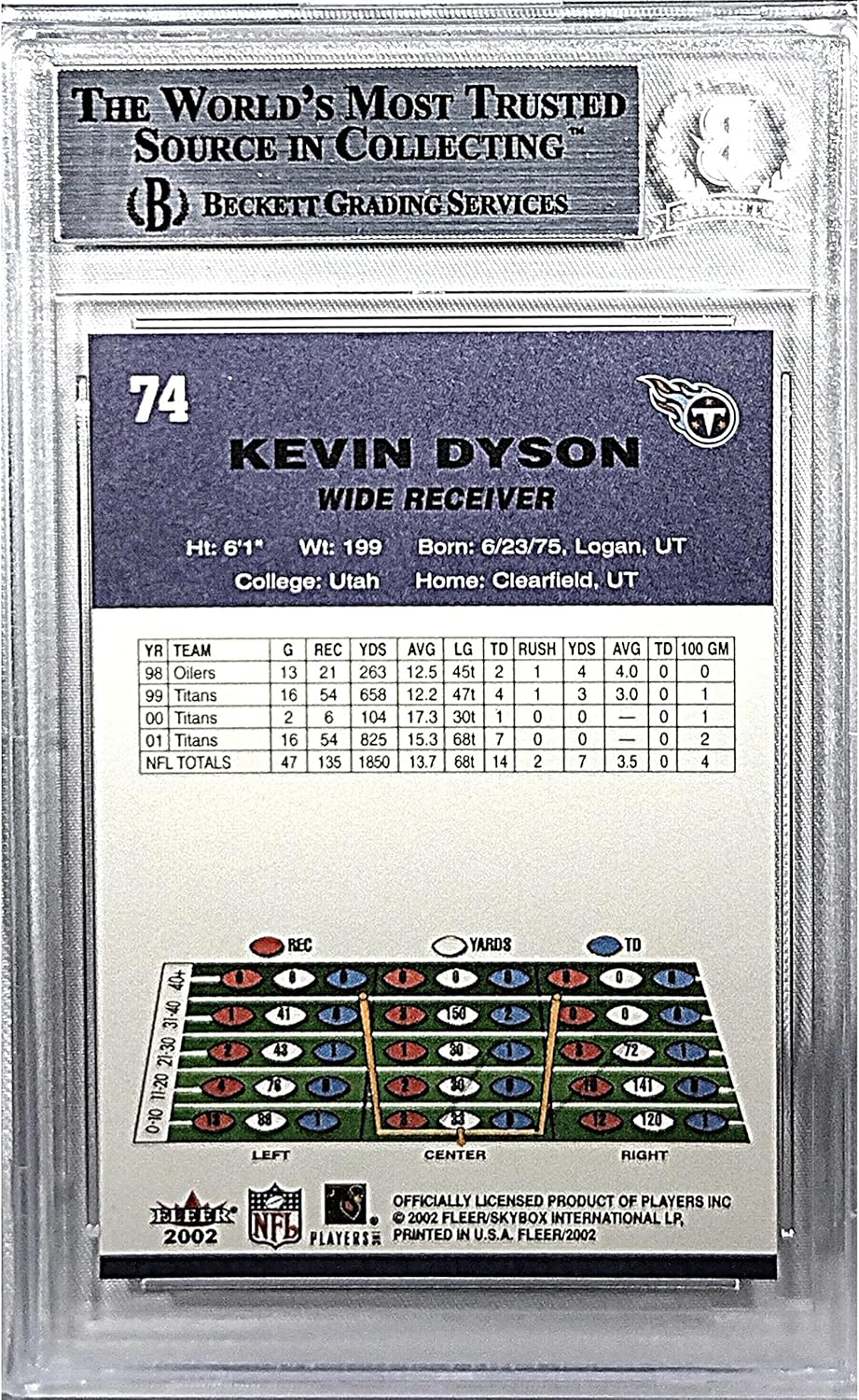 Kevin Dyson Signed 2002 Fleer Tradition Card #74, Beckett Authentic Autograph Slab, Tennessee Titans Autographed Football Memorabilia
