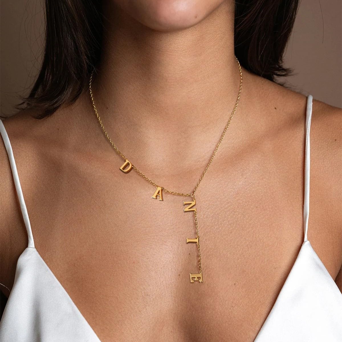 Lariat Name Necklace for Women, Personalized 18K Gold Long Y-Shaped Necklace Pendant with Letter Initial Family Choker Mother’s Day Jewelry Mom Gift