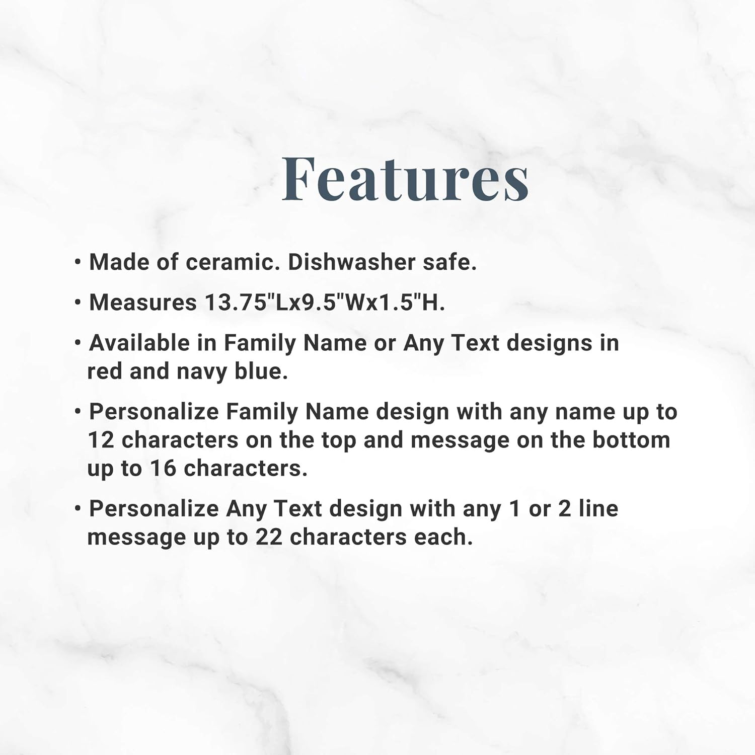 UNIQUELY PERSONALIZED: Choose navy blue (pictured) or red. Then customize with the Family Name design (pictured)—any name up to 12 characters and any message up to 16 characters—or Any Text design—any 1- or 2-line message up to 22 characters each.