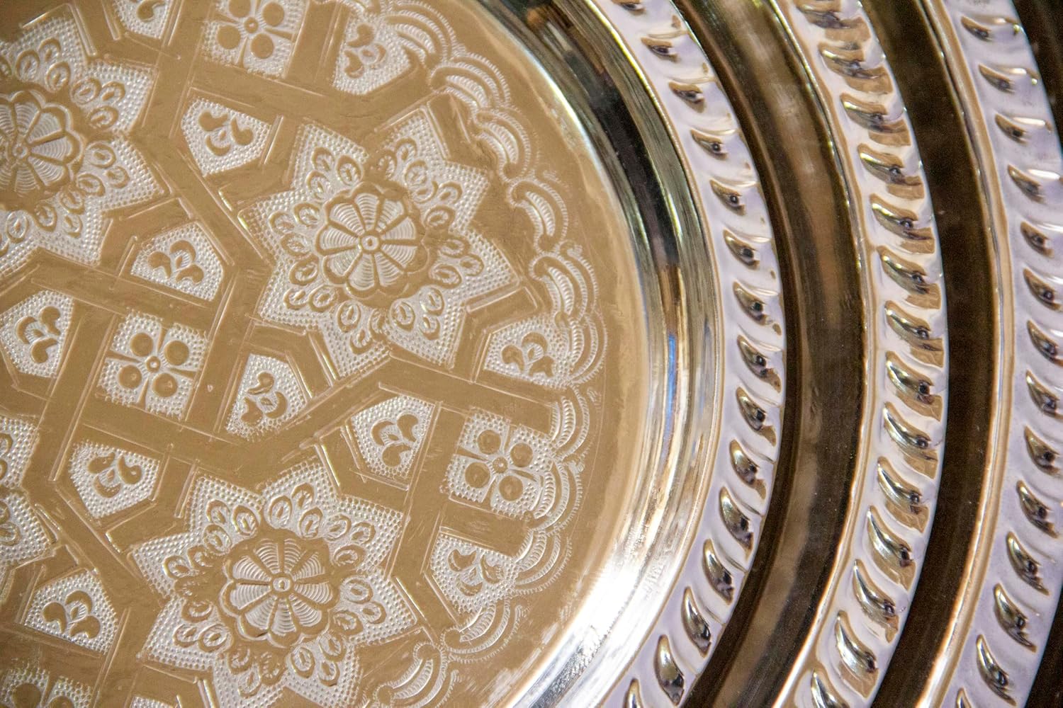 Each tray is meticulously hand-hammered by skilled artisans in Fez, Morocco, showcasing traditional Moroccan craftsmanship. The intricate engraved patterns reflect the rich cultural heritage of Moroccan metalwork, making each piece unique.