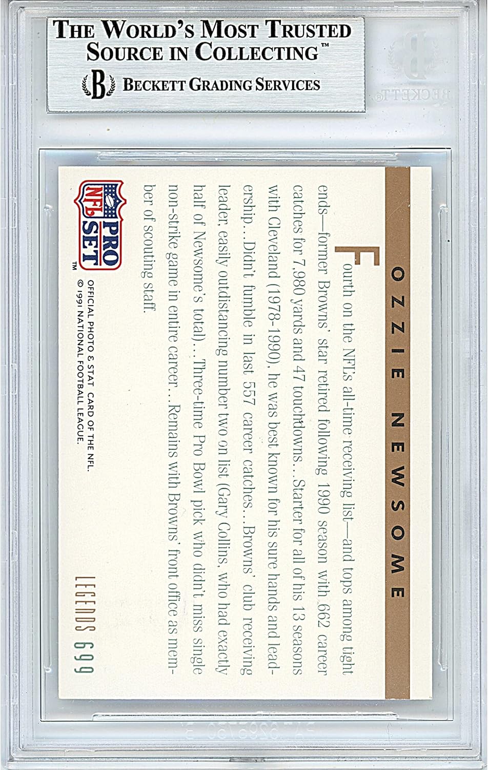 Celebrate the career of Ozzie Newsome with this autographed 1991 Pro Set football trading card #699. Ozzie Newsome, a legendary player for the Cleveland Browns and a prominent figure in football, has personally signed this card in black sharpie, adding his distinctive touch. The authenticity of the signature has been thoroughly examined and verified by Beckett Authentication Services (BAS). The Beckett authentication number is 00013695121, ensuring the card’s authenticity and value. This autographed football card is encased in a secure and protective Beckett slab measuring 3.25″ x 5″. The slab not only safeguards the card but also adds an extra layer of authenticity and collectible value. For fans and collectors, this autographed card holds tremendous significance. It represents Ozzie Newsome’s enduring impact on the game of football and his contributions to the Cleveland Browns. The inclusion of the Beckett slab ensures the card’s long-term preservation and enhances its desirability among collectors. It provides peace of mind that the card remains in excellent condition while displaying Ozzie Newsome’s authentic signature. Football enthusiasts and avid collectors will appreciate the authenticated signature, association with the Cleveland Browns, and the protective Beckett slab. This autographed card becomes a cherished piece of memorabilia, commemorating Ozzie Newsome’s remarkable career and the legacy of the Alabama Crimson Tide.