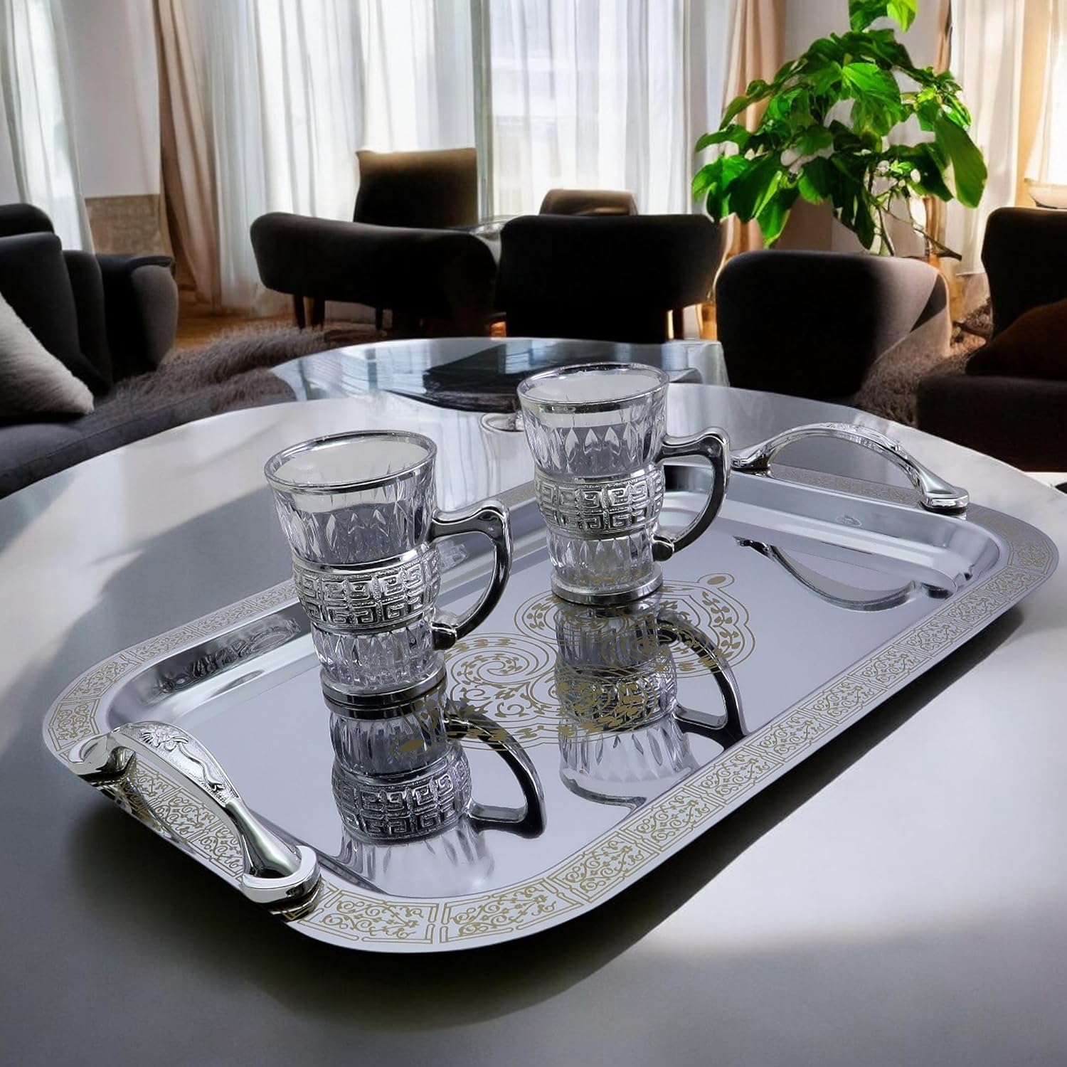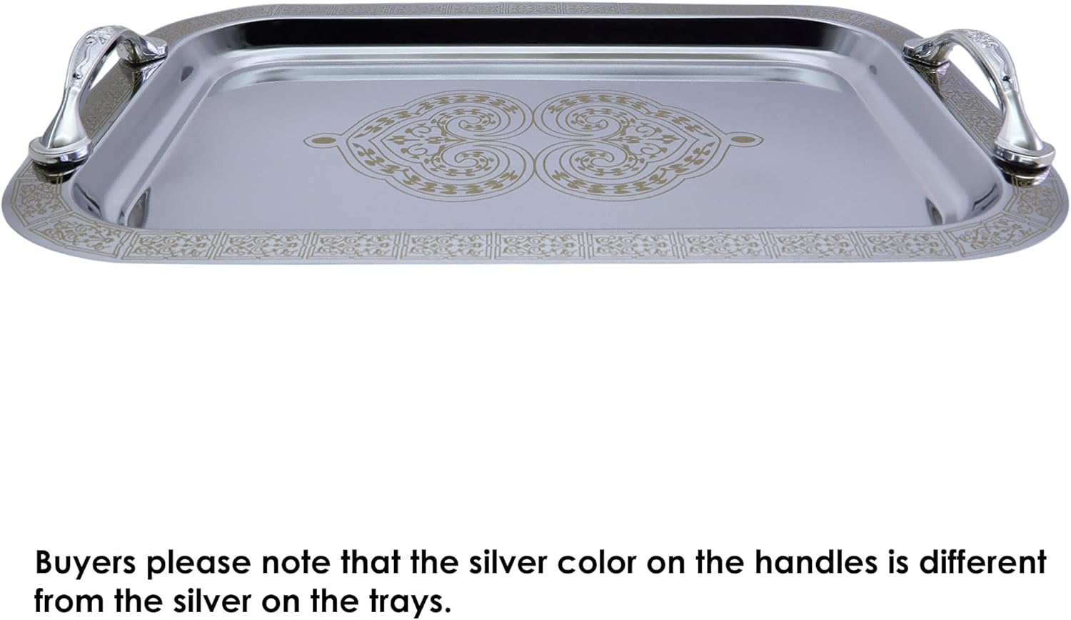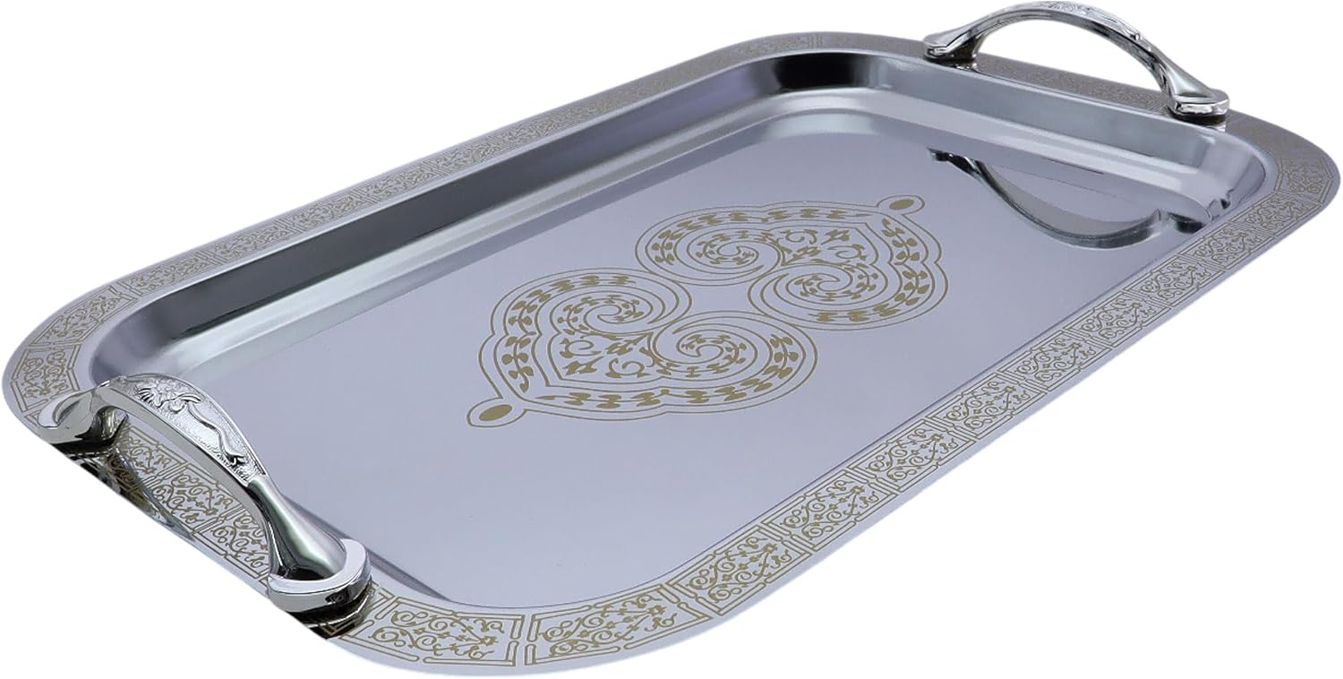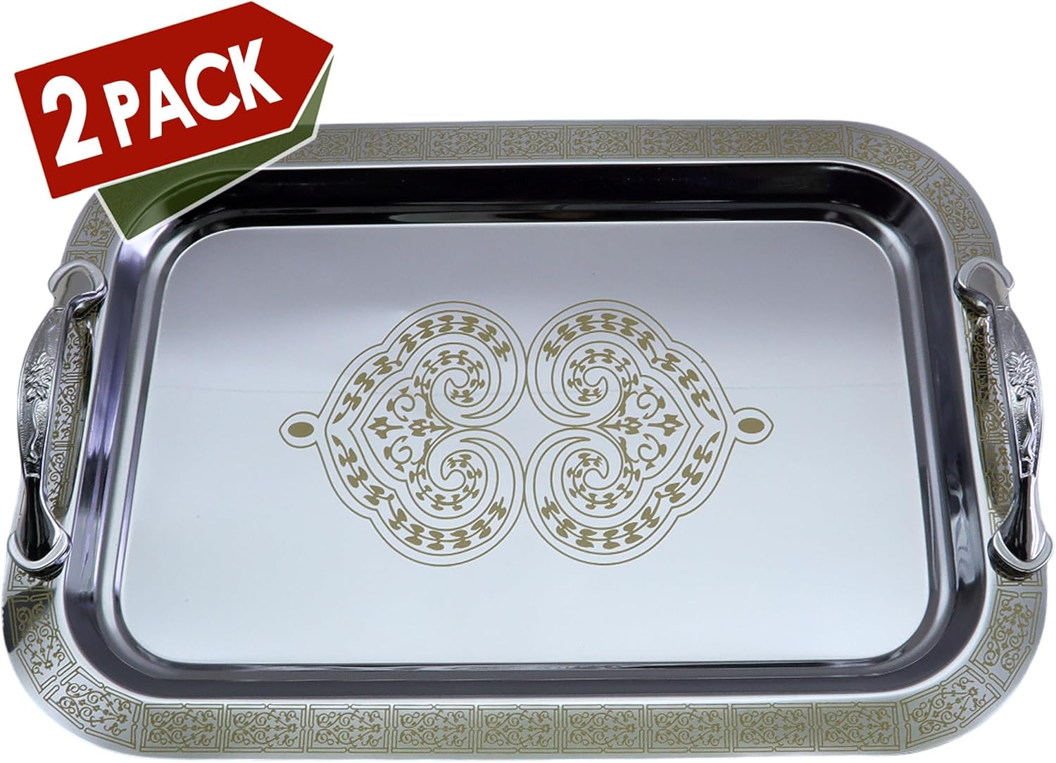 Pack of 2 elegant serving trays, outside dimension: 33.8 cm x 23.8 cm x 1.6 cm (or 13.3 inch x 9.4 inch x 0.6 Inch). (Tray size only; handle size is NOT included.)