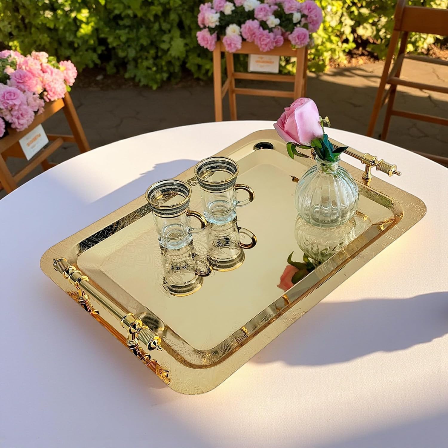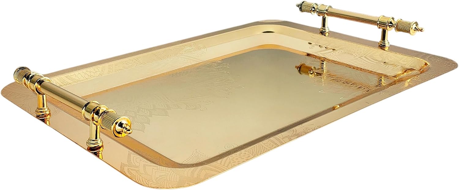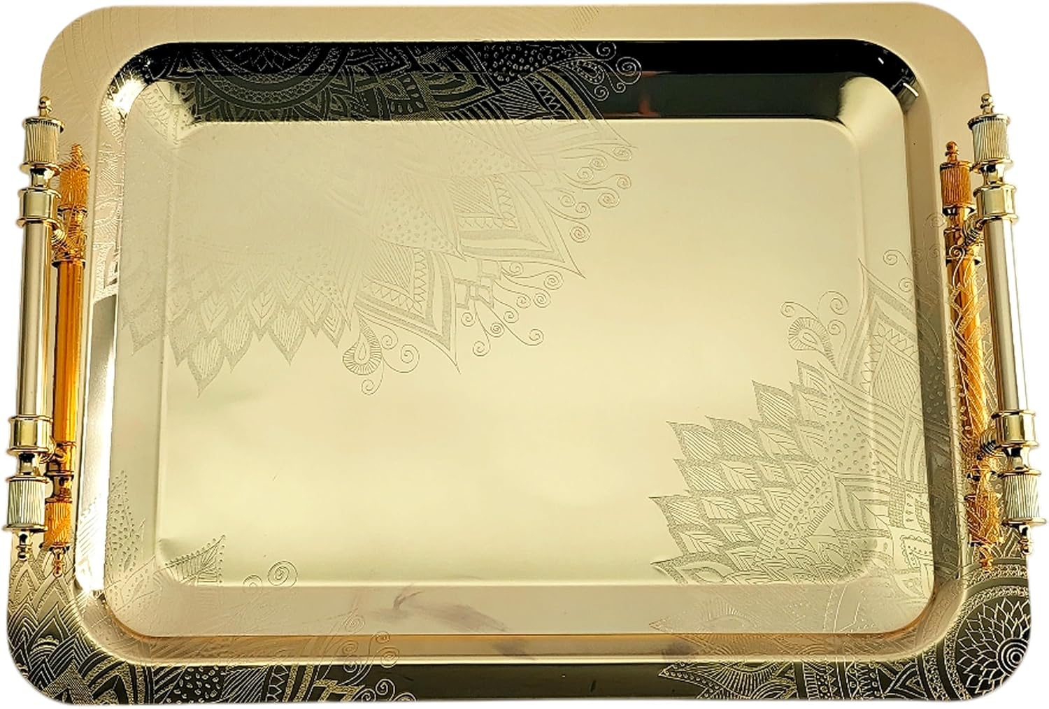 An effortlessly charming decorative piece at an affordable price. Featuring a gold-plated, high-quality iron finish with a mirrored reflection, it’s perfect for the holidays or everyday use. This multi-purpose serving tray is ideal for buffet and catering services.