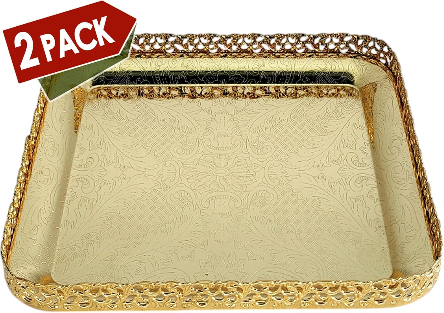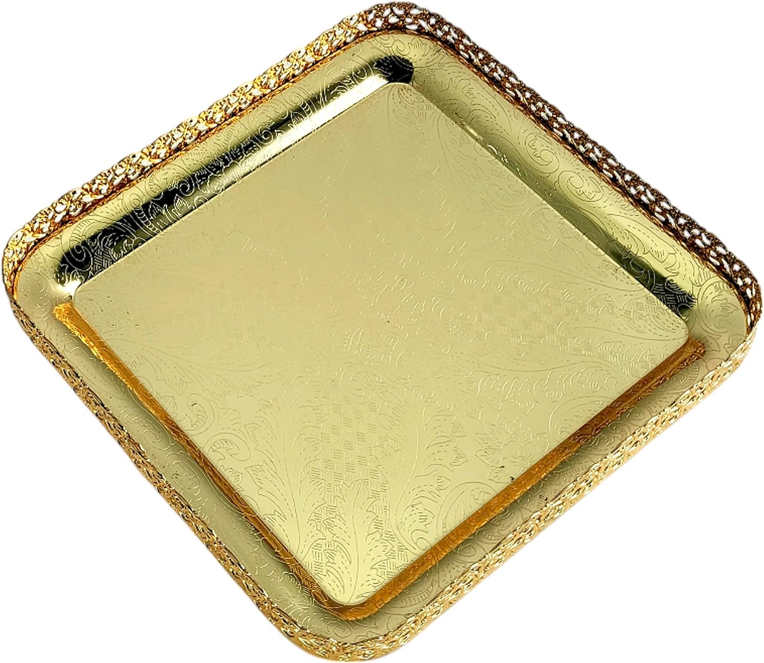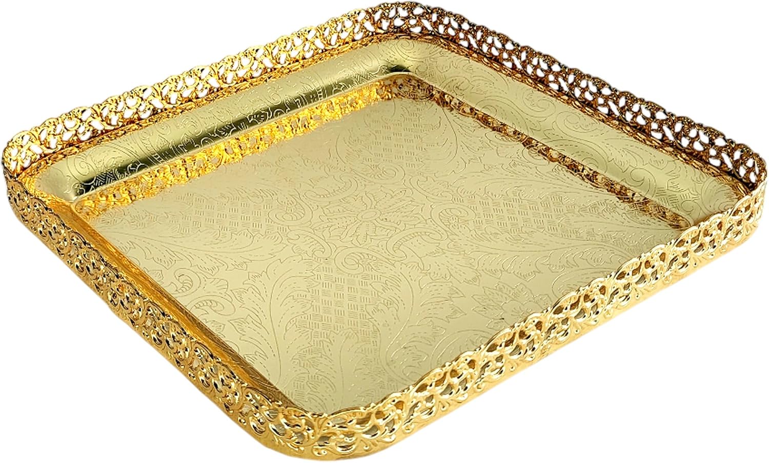 (Pack of 2) 9.1 inch x 9 inch Square Iron Gold Serving Tray Stylish Design Floral Engraved Edge Decorative Birthday Dessert Buffet Platter Plate Birthday Gift Base Dish NC-035