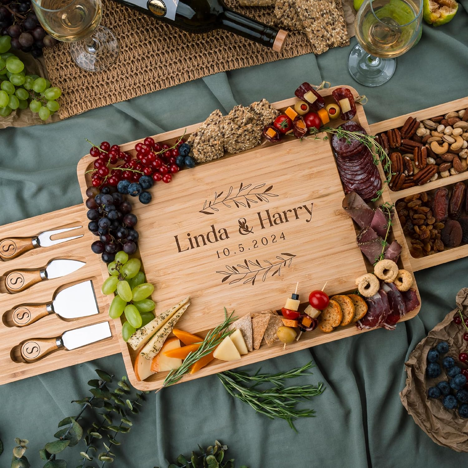 Custom Engraved for Memorable Moments Personalized Bamboo Charcuterie Board Set with Cheese KnivesPersonalized Bamboo Charcuterie Board Set with Cheese Knives