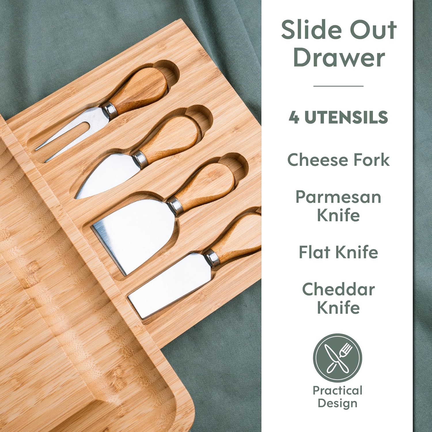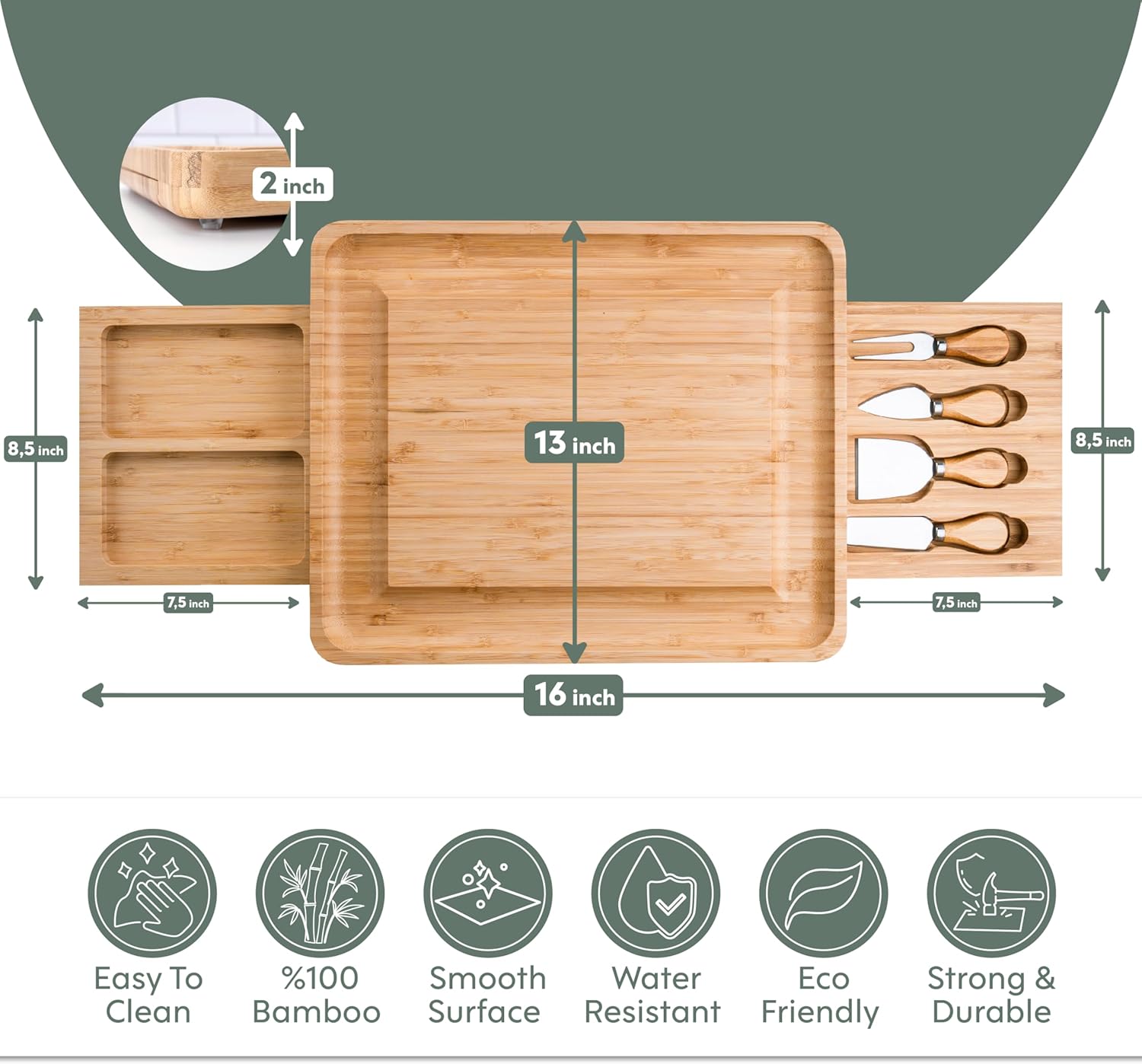 All-in-One Serving Experience: Features a large 16″ x 13″ bamboo serving area, two side drawers for snacks, and a hidden slide-out drawer with 4 essential cheese knives: Cheese Fork, Parmesan Knife, Flat Knife, and Cheddar Knife.