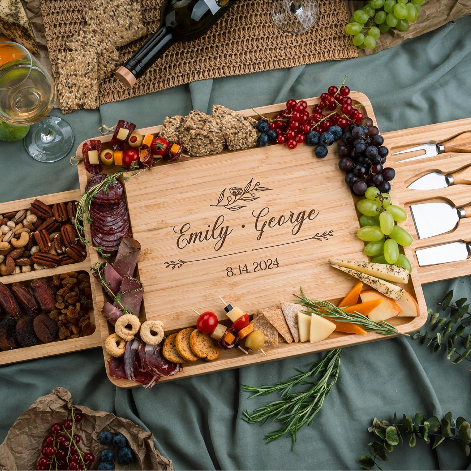 Personalized Bamboo Charcuterie Board Set with Cheese Knives, Custom Engraved Large Cheese Platter & Nut Tray, Unique Wedding, Anniversary, Housewarming, Birthday Gift for Couples
