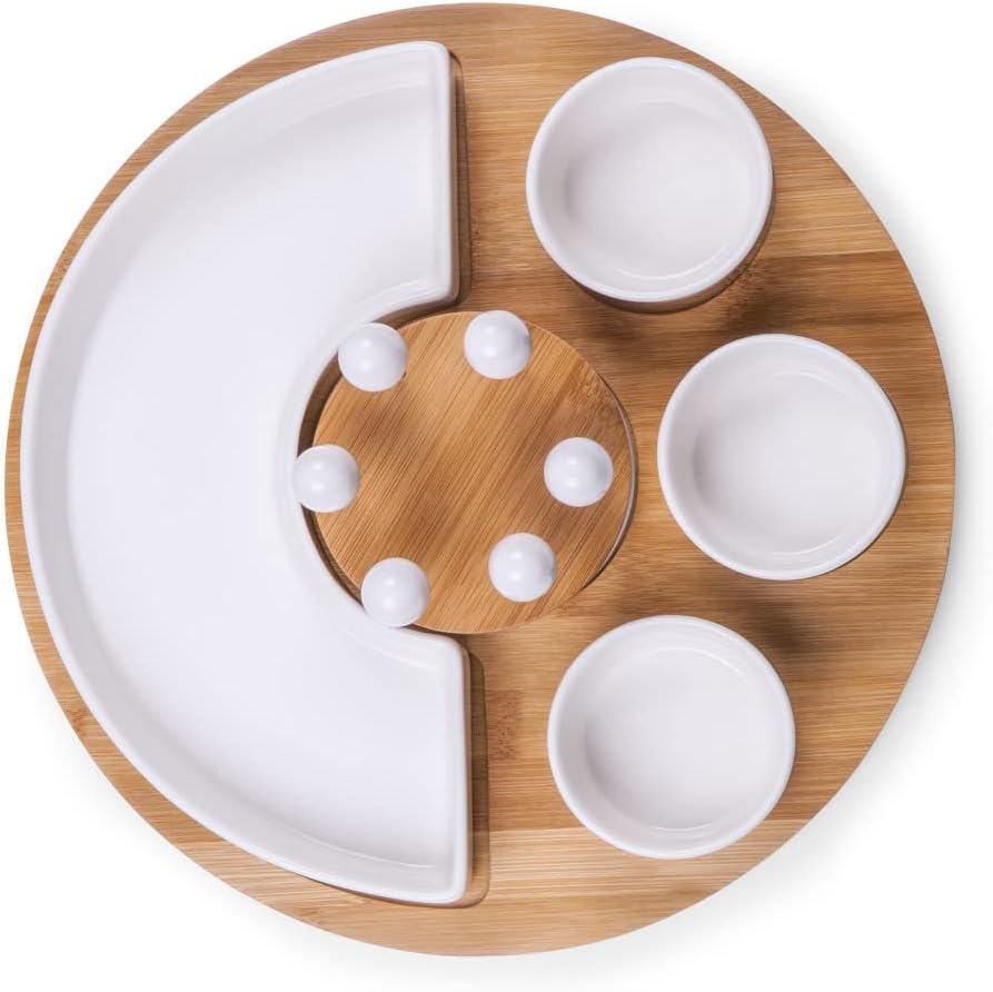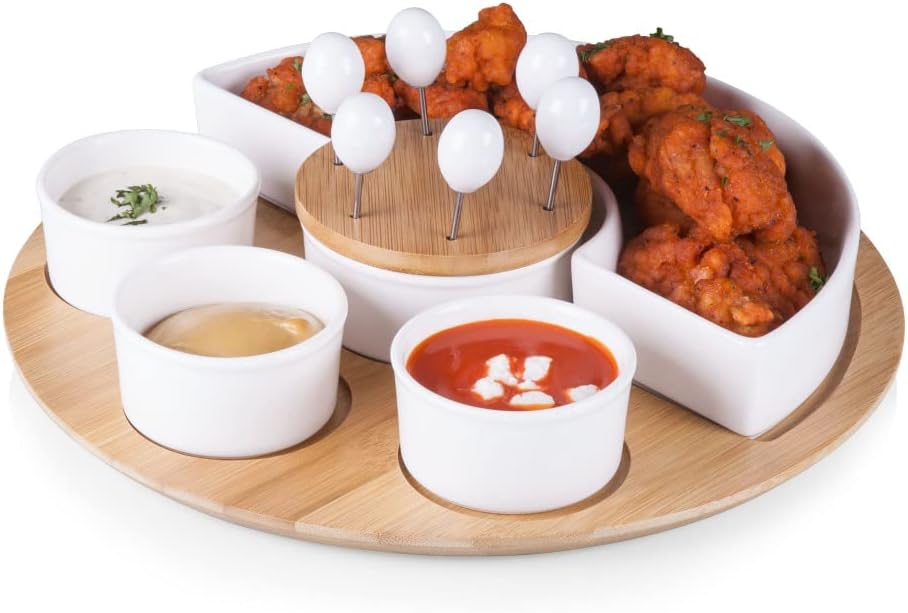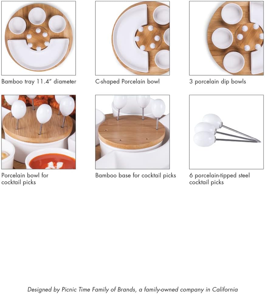 Features a beautiful 11-1/2 inch bamboo base tray with half circle bowl, plus assorted dip/snack bowls and six cocktail picks