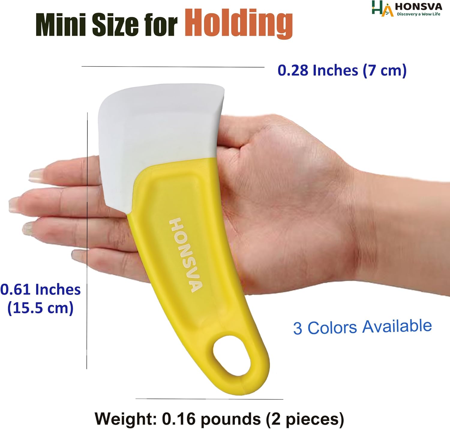 What you get: Package includes 3 bowl scraper with 3 colors (green, yellow and red ) in the package Each size is 0.61 (L) *0.28 (W)* 0.03 (H) inches. 60 days Free-Return Guarantee.