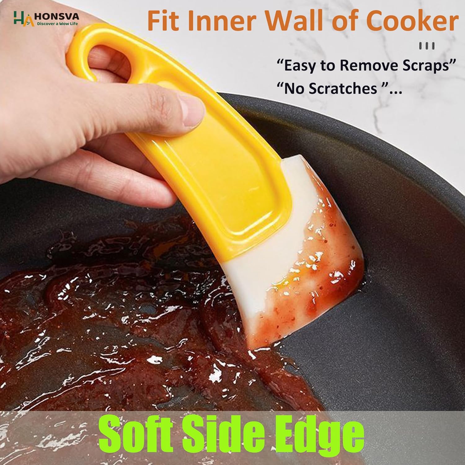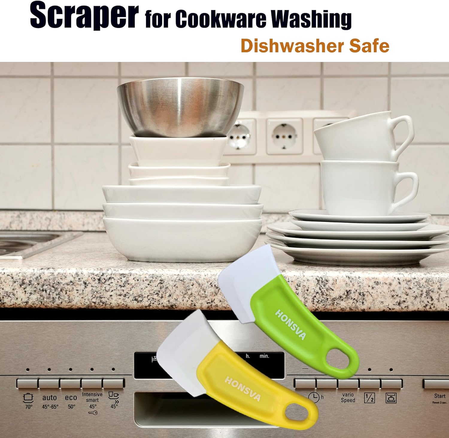 Soft and Durable: The flexible edge of plastic pan scraper tool is made of soft silicone with high-heat resistant feature, BPA-free, gentle scrapping or removing the last bit of leftover from container, clean hard-to-reach areas with ease, without leaving any residue, safely applied to glass, stainless steel, china, Teflon pan, no scratch on your cookware and dinnerware, long life-time even under the hot water, dishwasher safe, an eco-friendly solution to cleaning.