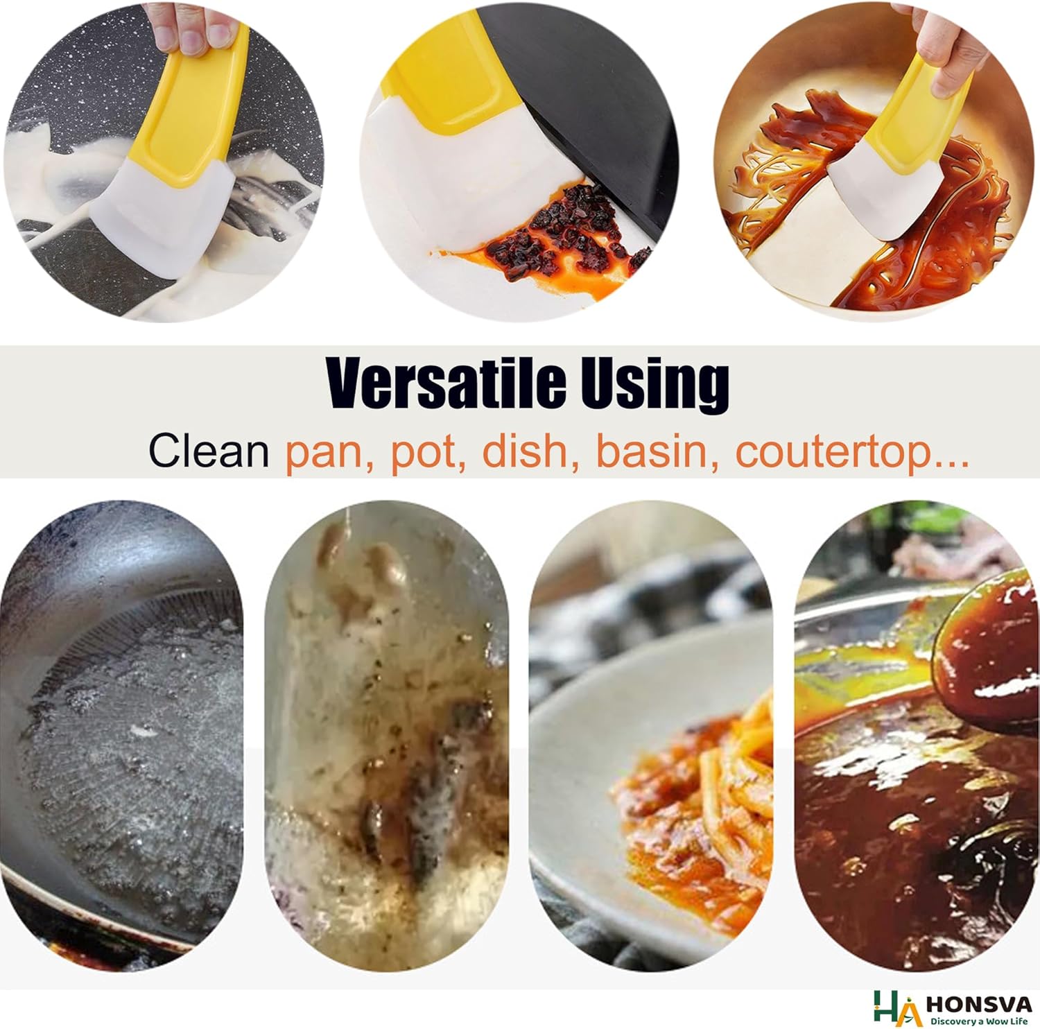 No-Waste and Eco-Friendly: The soft plastic pan scraper edge can seamlessly fit to many kinds of surface or inner wall of cookwares, easy to remove leftovers. The pot scrapers for kitchen effectively help to reduce water and detergent usage when cleaning, less waste when baking. More friendly and environmental.