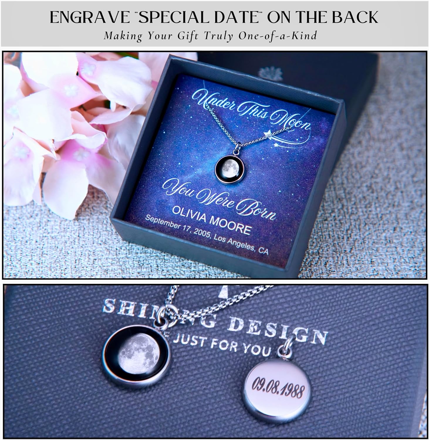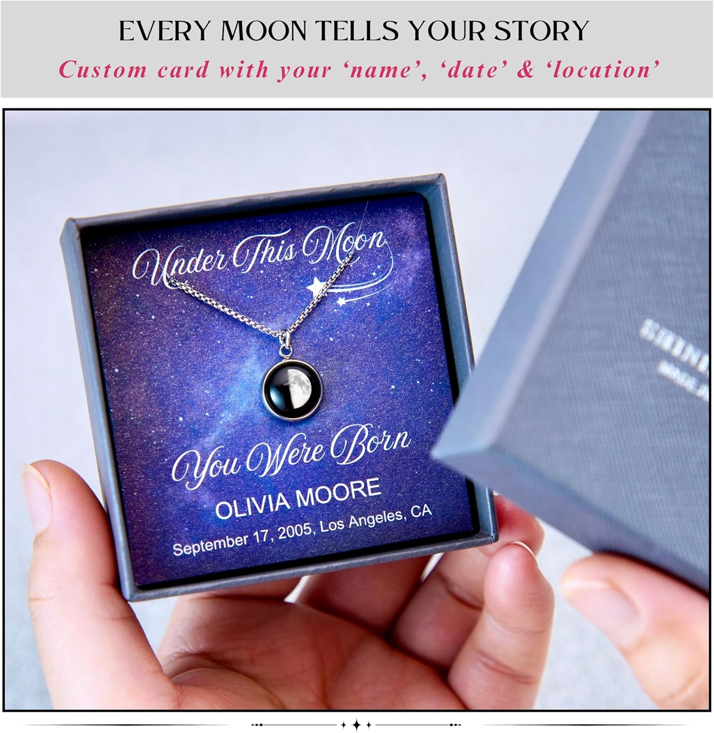 Transform your precious memories into a beautiful, lasting treasure with our Custom Birth Moon Phase Necklace.