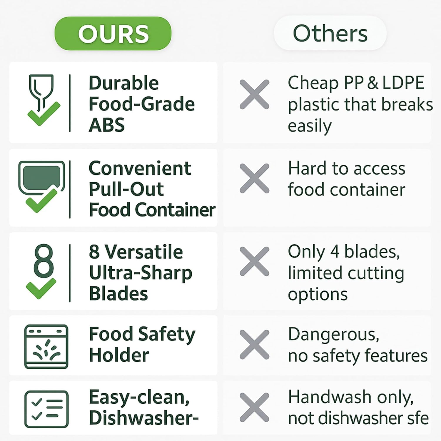 Safe & Easy Food Prep Tool with Hand Guard Our food chopper includes a safety hand guard and finger protector so you can chop and slice confidently without accidental cuts. Perfect for everyday cooking and family kitchens.