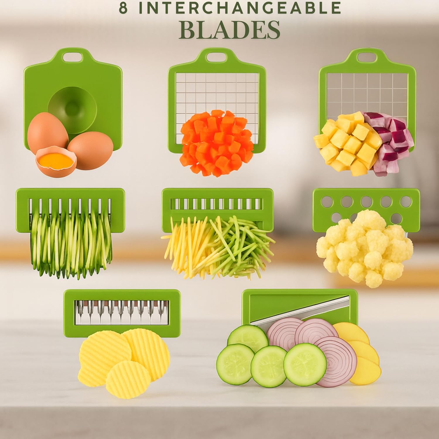 8 Ultra-Sharp Stainless Steel Blades for Precision Cuts Interchangeable blades create perfectly uniform slices of onions, carrots, potatoes, cucumbers, cheese, or fruits. Ideal for meal prep, salads, stir-fries, and healthy snacks.