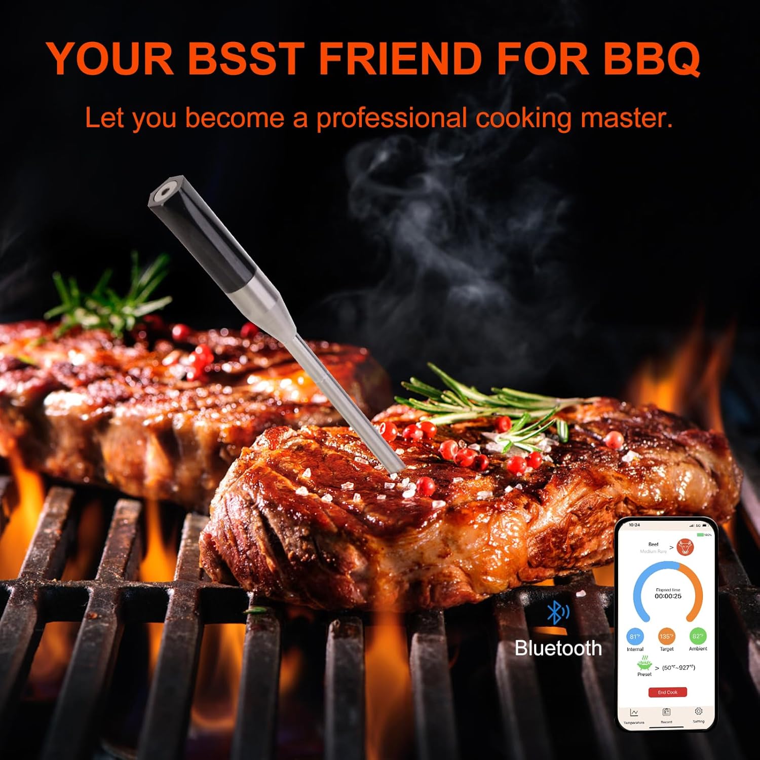 Unlock 493 feet of wireless cooking experience.This wireless cooking thermometer for meat Its advanced Bluetooth 5.2 technology ensures stable and widespread connectivity, giving you the freedom to monitor your cooking virtually anywhere.