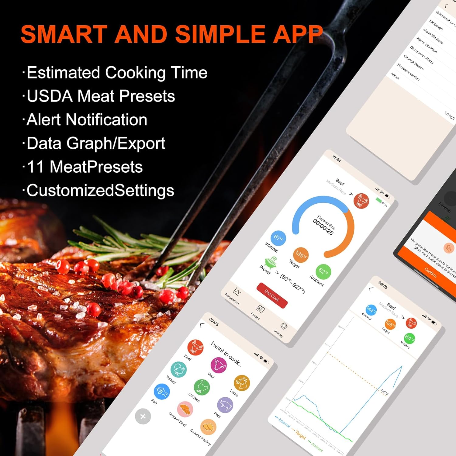 Wireless grill thermometer enjoy easy control with an intuitive app – no complicated logins, direct set target temperatures, real-time alarms, customizable timers, temperature charts and 29 USDA presets.