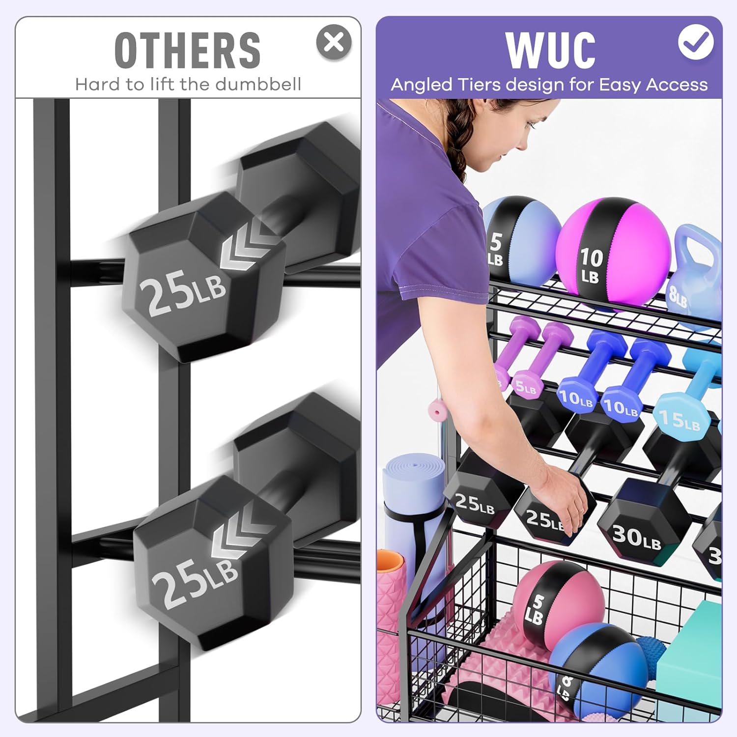 【Extra Large Capacity】: This weight rack for dumbbells features an extra-large capacity with three tiers for dumbbell storage racks, a side basket designed for yoga mats and foam rollers, and multiple hangers for resistance bands and roller wheels. The bottom ball storage is ideal for keeping balls, yoga blocks, and various exercise