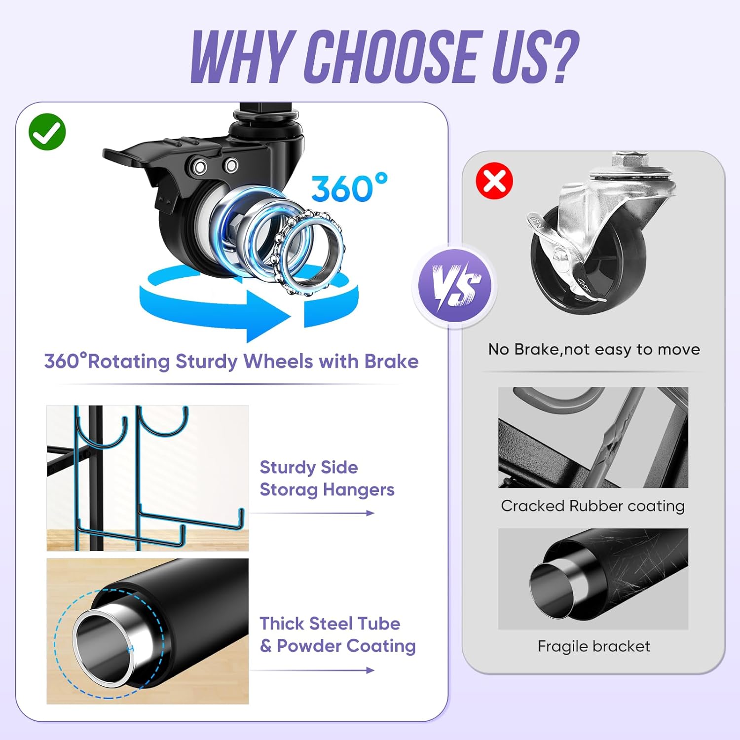 【Movable & Fixed Available Storage Rack】 : Our dumbbell set with rack is equipped with 4 silent universal wheels (including two with brakes) for effortless maneuverability, allowing you to smoothly reposition it wherever needed. Additionally, we provide optional fixed feet that can be installed as required, ensuring stability and preventing wobbling on uneven surface