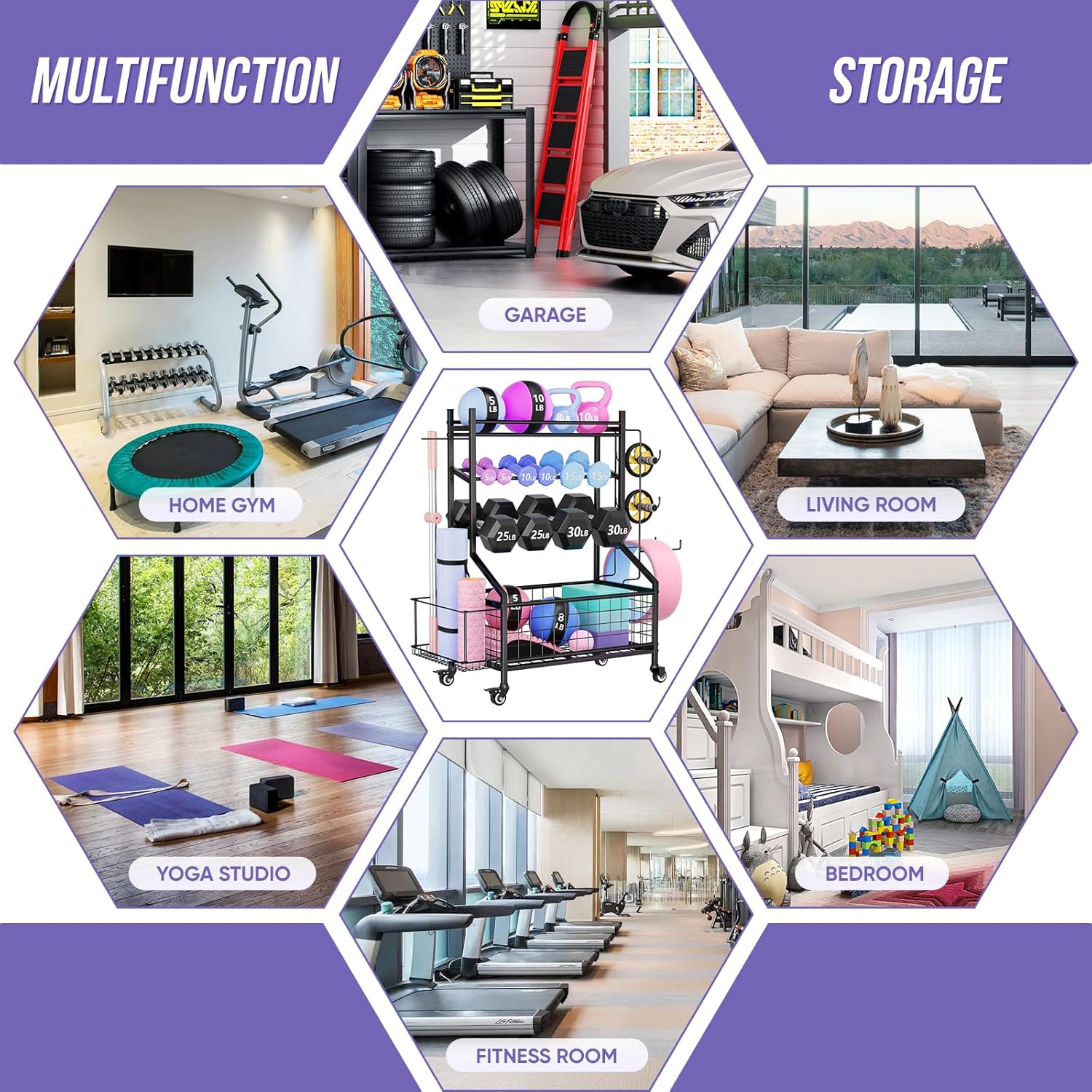 【ALL-IN-ONE Dumbbell Rack】: This weight rack for home gym can accommodate your dumbbells, kettlebells,yoga mats, yoga blocks, stability balls, resistance bands and foam rollers, etc. It smartly organizes all workout equipment in a one storage rack while optimizing home gym storage capacity